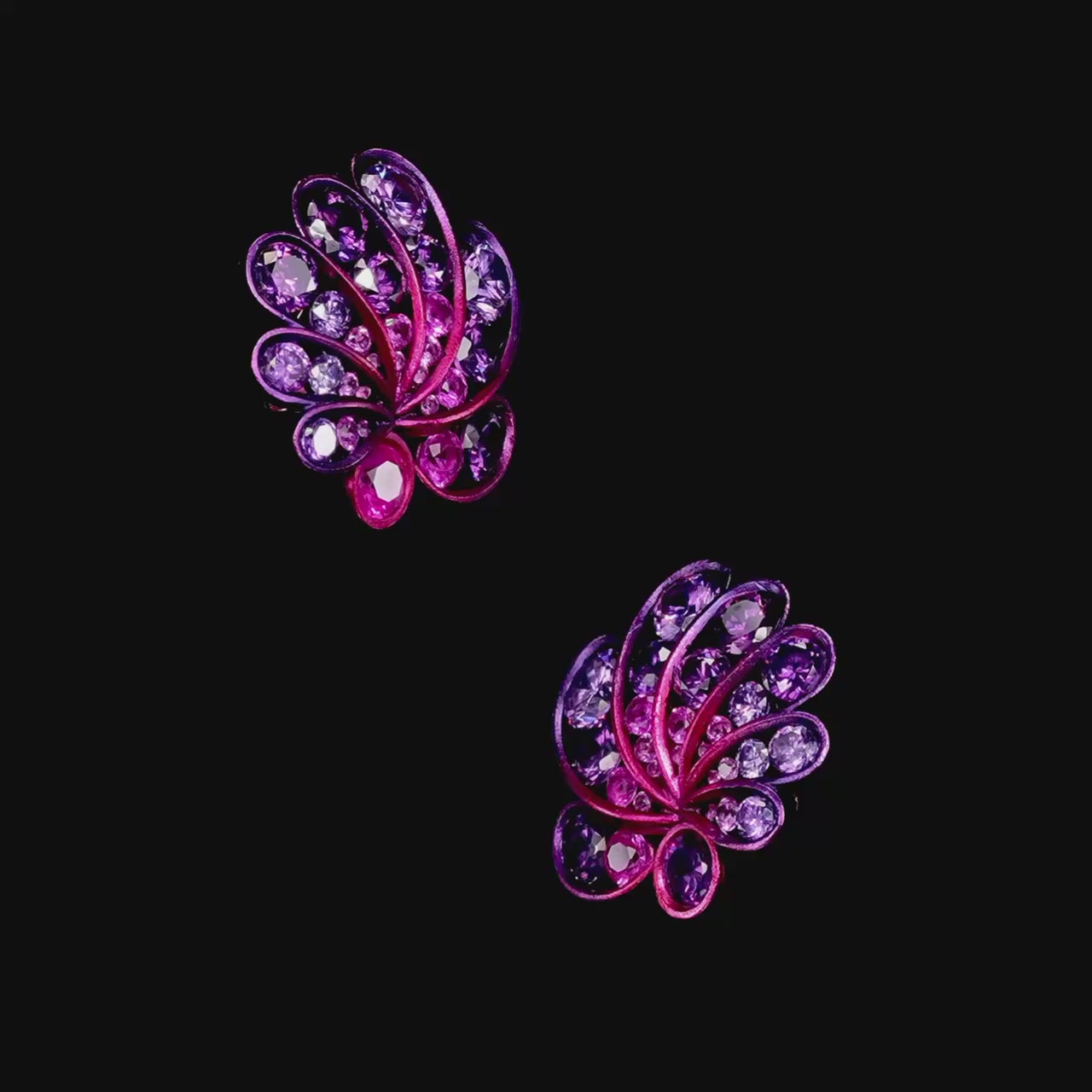 Anodised aluminium, 18k yellow gold vermeil with 14k yellow gold earrings posts, 102 laboratory-grown and created gemstones including pink sapphires and violet amethysts.- ¥346,500