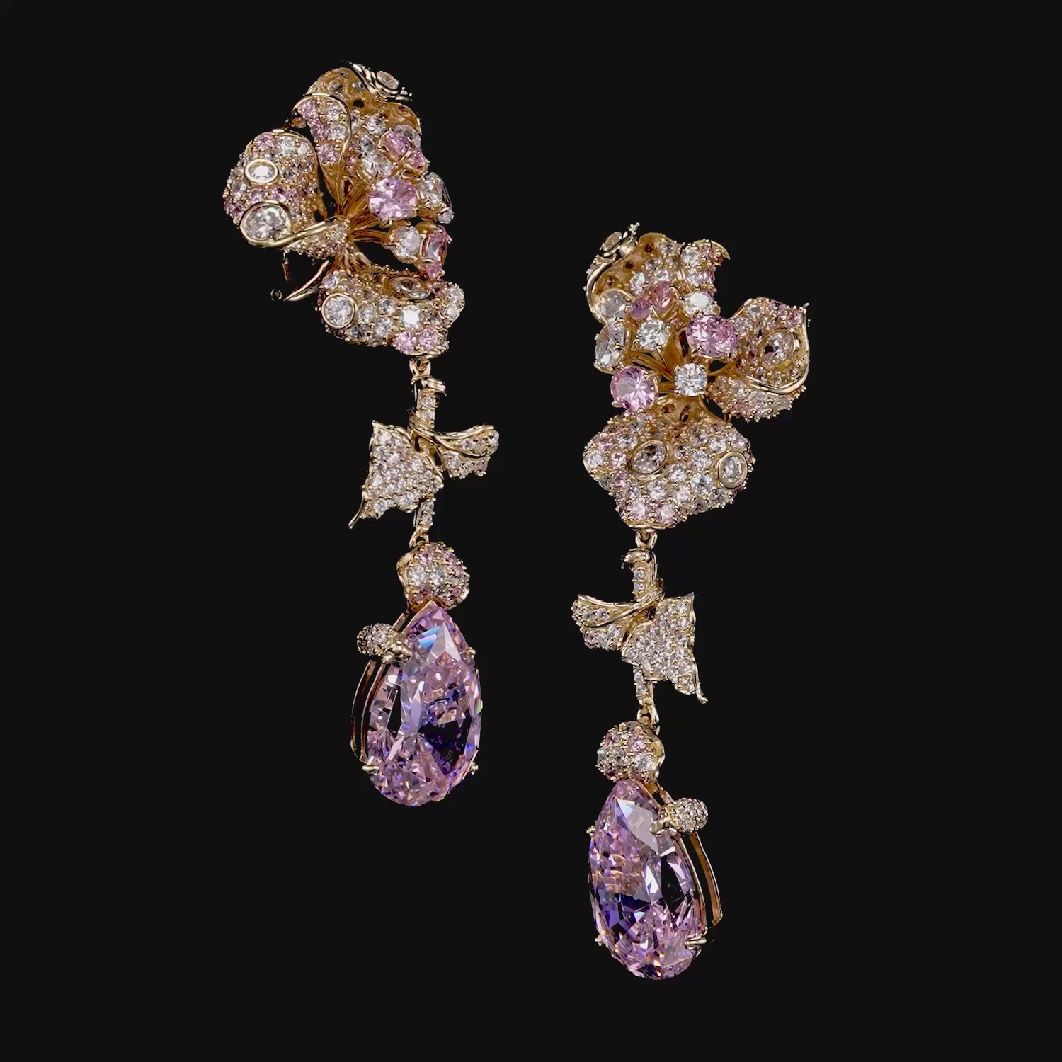 Anodised aluminium, 18k yellow gold vermeil with 14k gold earring posts, 30 laboratory-grown gemstones including pink sapphires and simulated white diamonds- ¥212,900