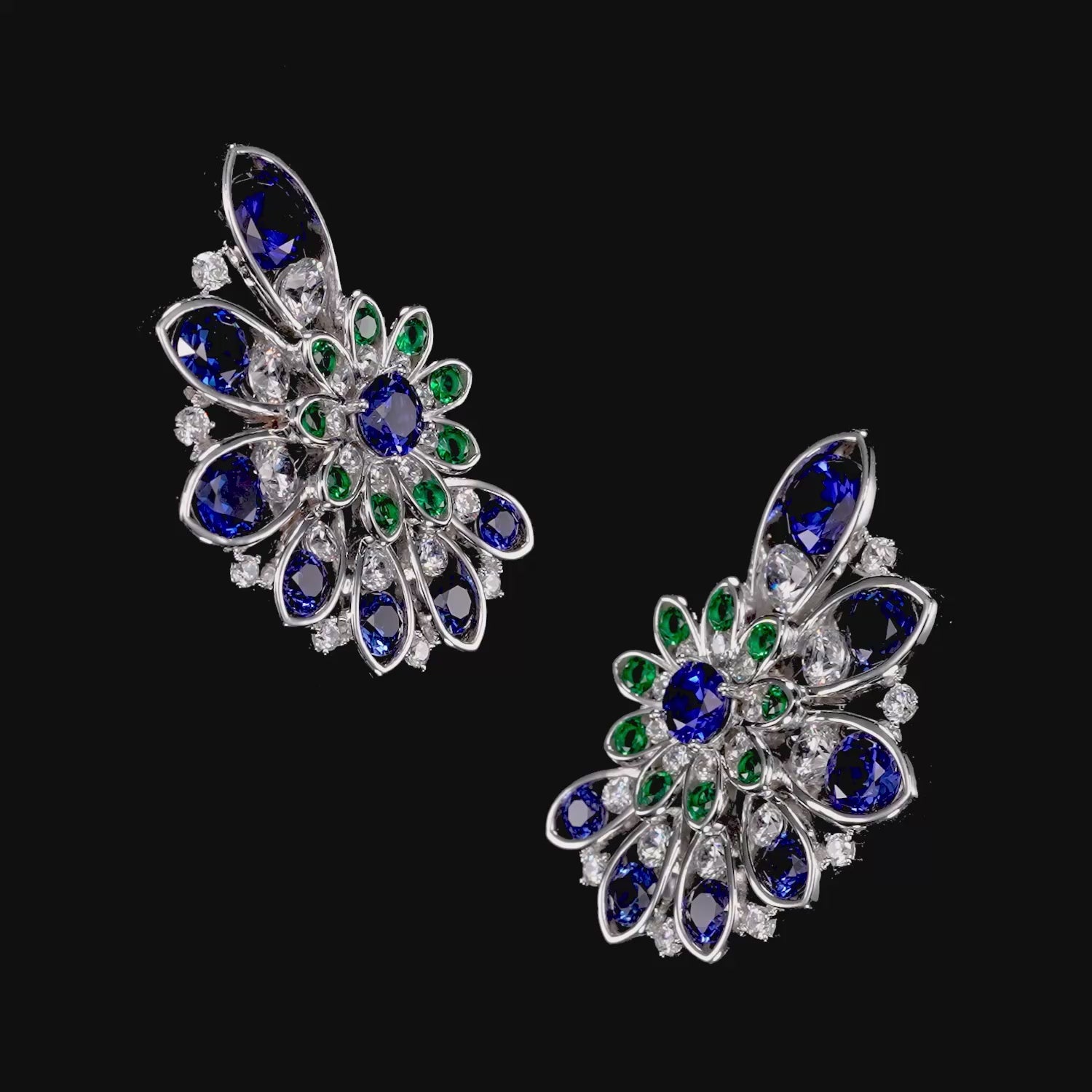 Rhodium vermeil, 14k white gold earring posts with laboratory-grown and created gemstones including emeralds, Royal blue sapphires and simulated white diamonds- ¥535,400