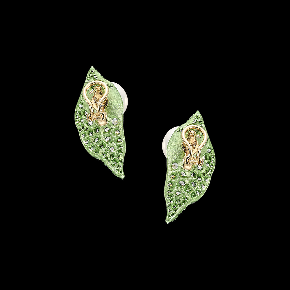 Recycled aluminium, 18k yellow gold vermeil with 14k yellow gold earrings posts, 96 laboratory-grown simulated white diamonds and 2 freshwater pearls