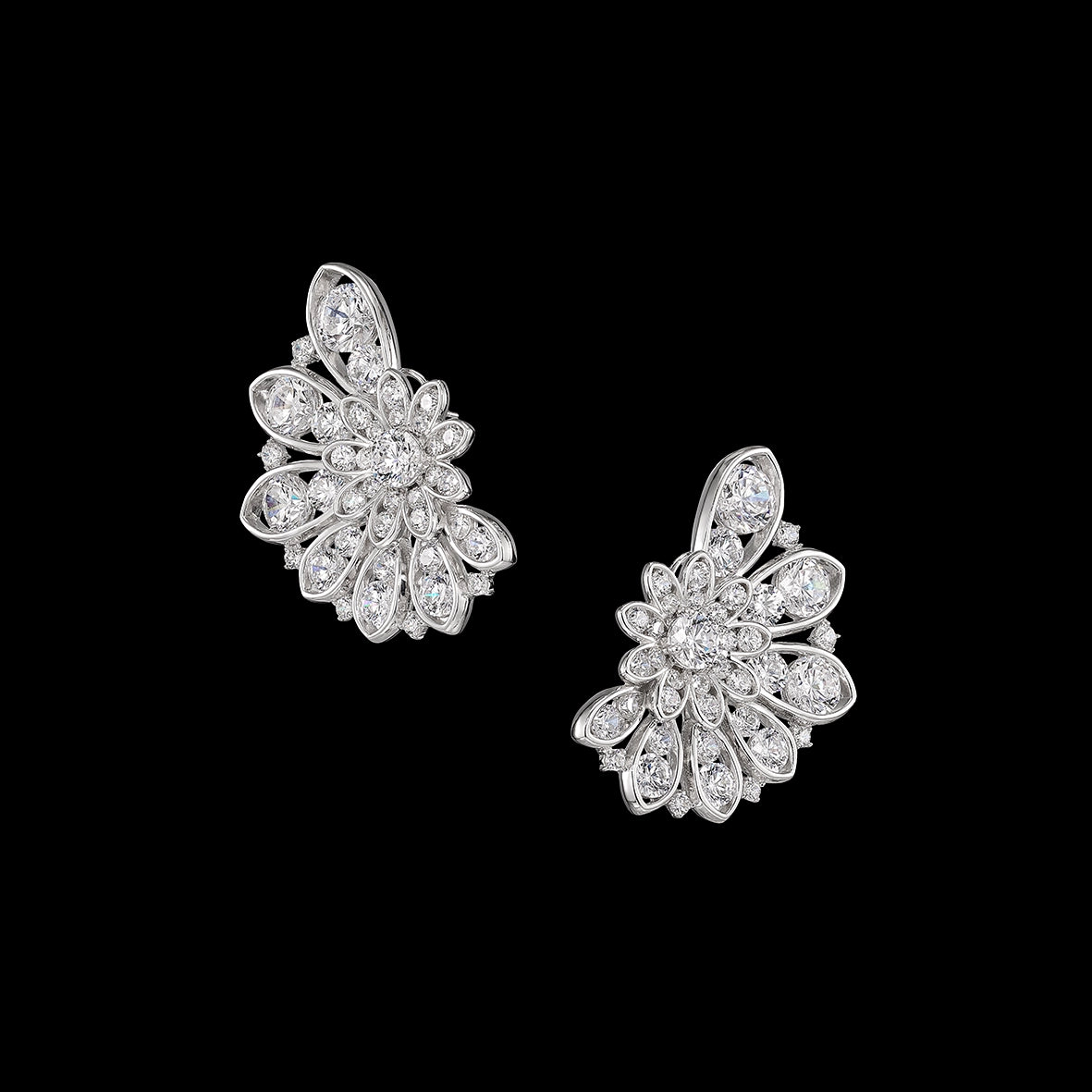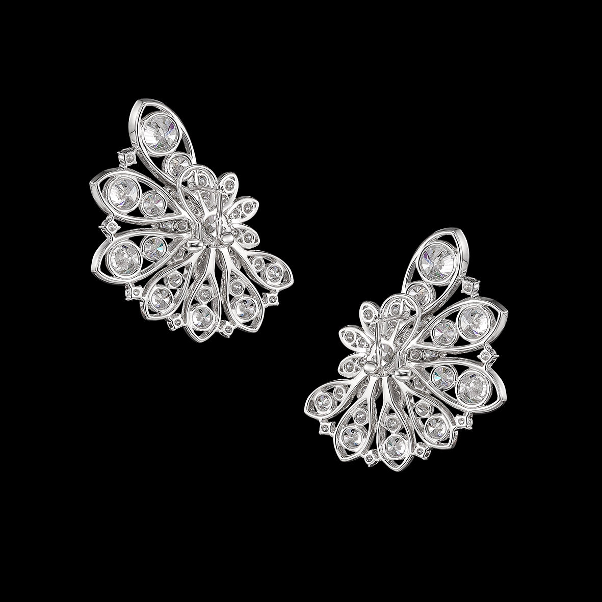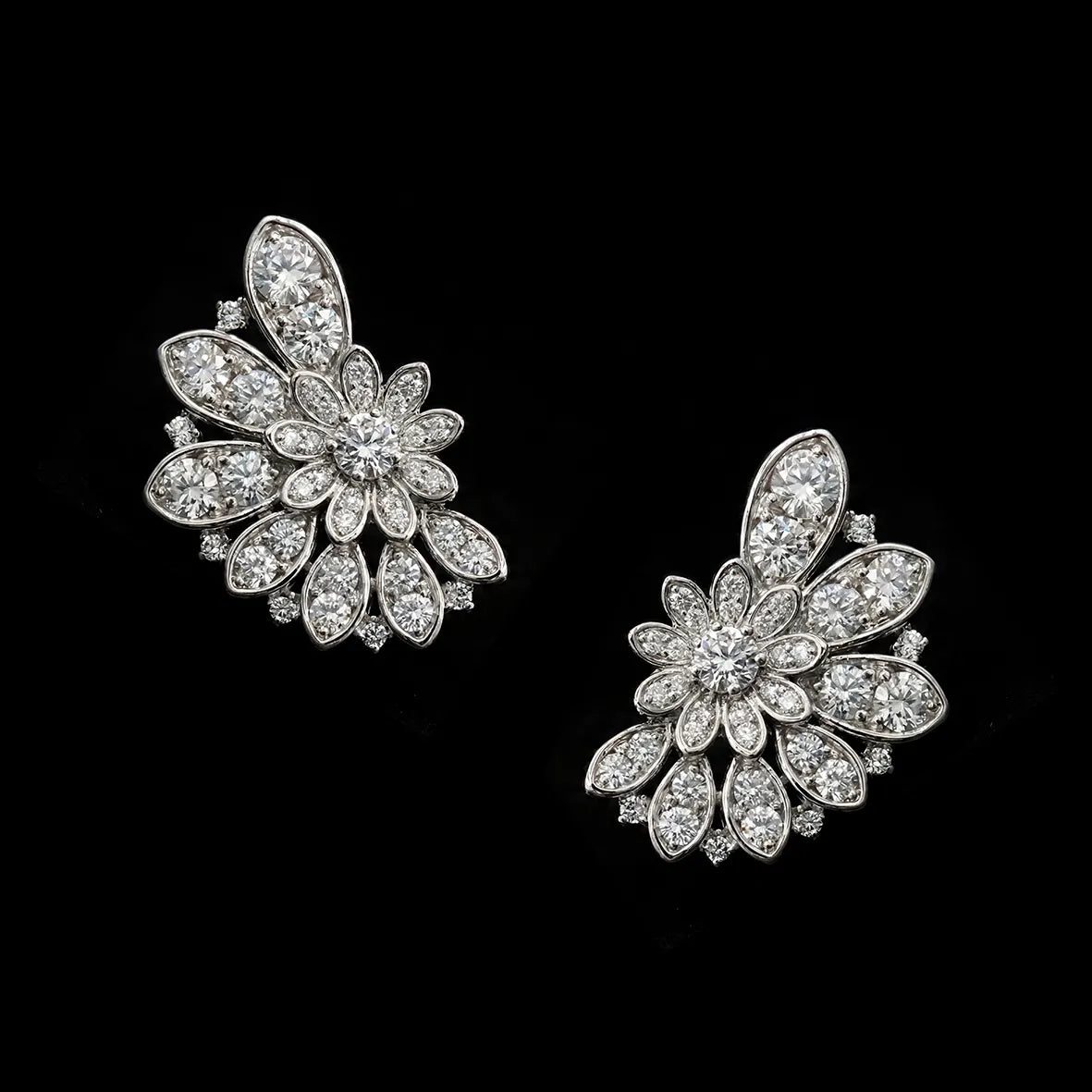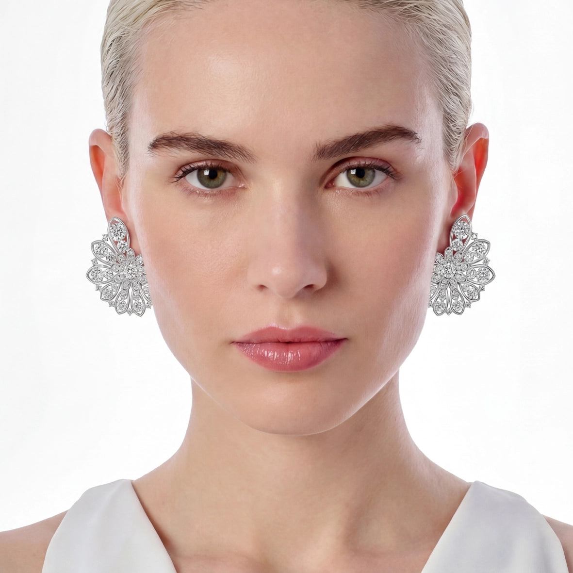 An organic pair of earrings rhodium vermeil, with 14k gold earring posts and omega backs, hand-set with laboratory-grown simulated white diamonds.