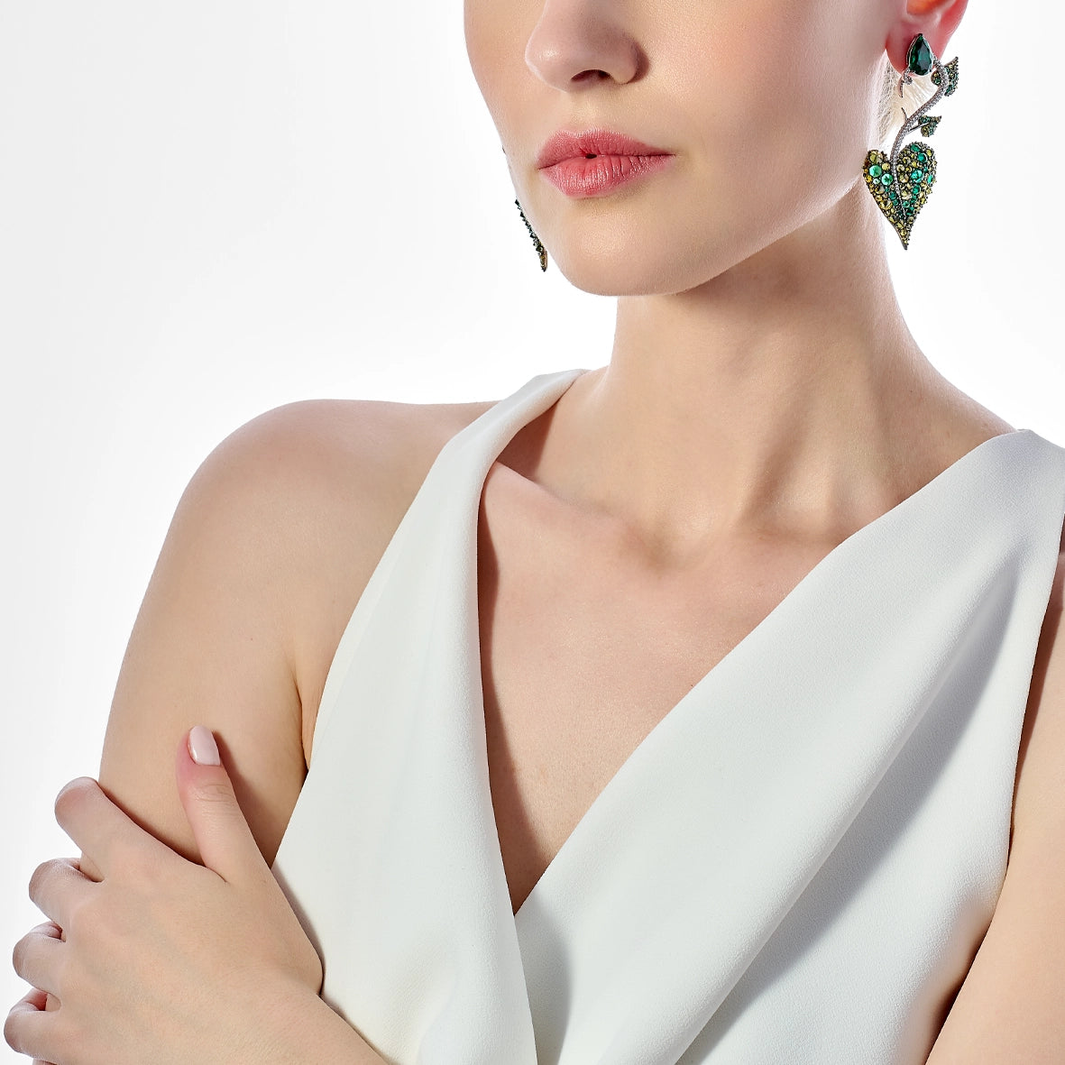 Rhodium vermeil with 14k gold earring posts, 437 laboratory-grown gemstones including emeralds, peridots, green tourmalines and simulated white diamonds.