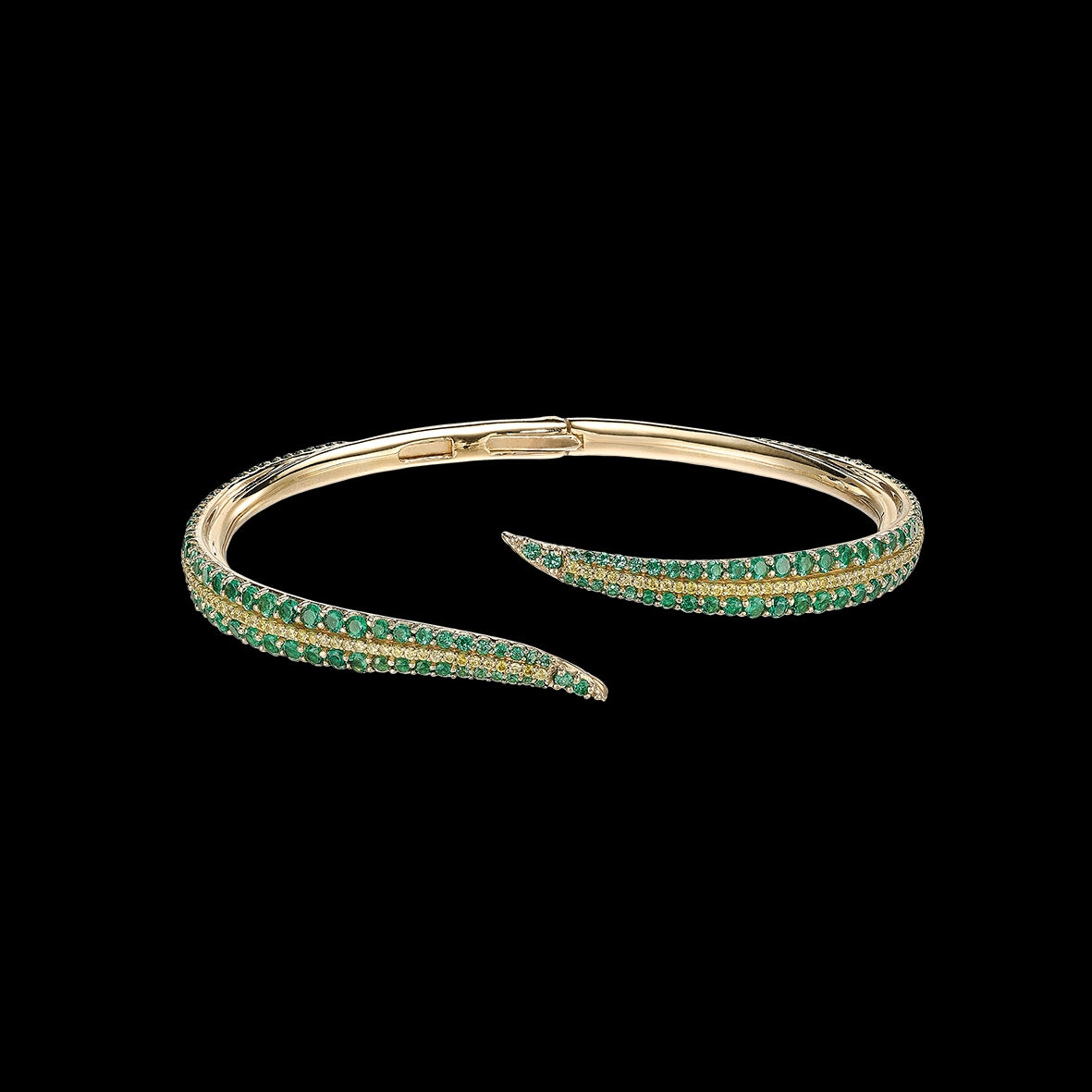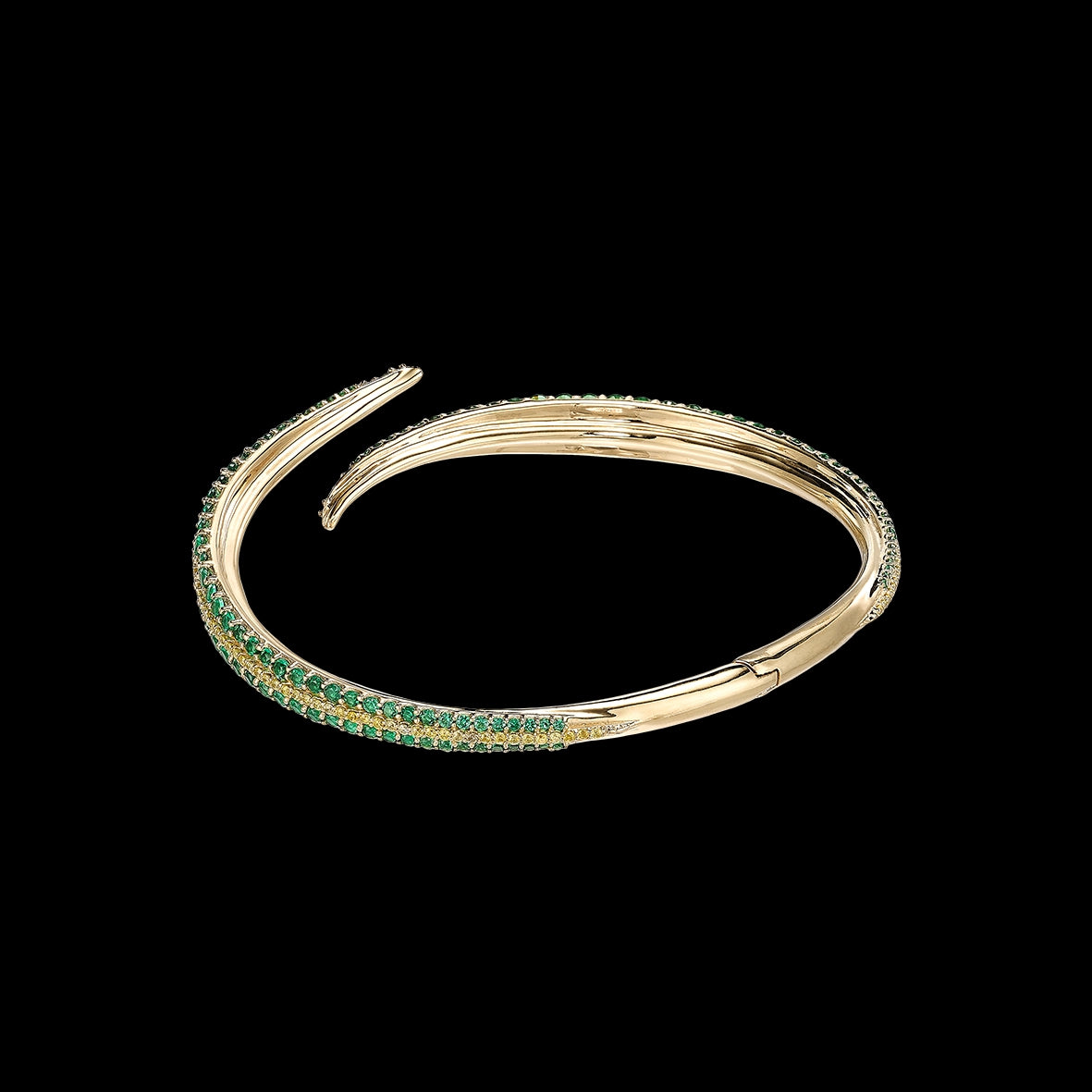 A modern spring hinge bangle bracelet in 18k yellow gold vermeil, intricately hand-set with laboratory-grown and created gemstones including emeralds and peridots.