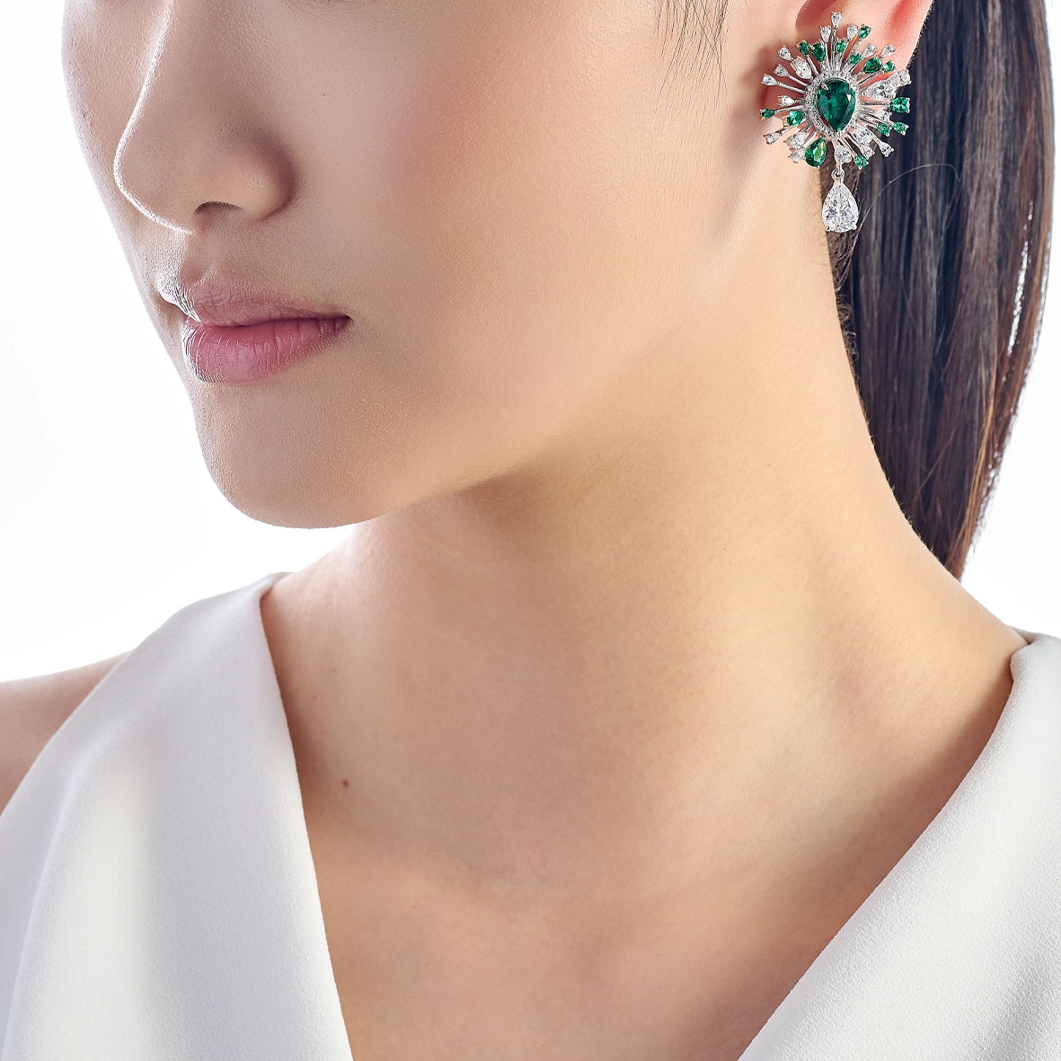 Rhodium vermeil with 14k gold earring posts, 110 laboratory-grown emeralds and simulated white diamonds
