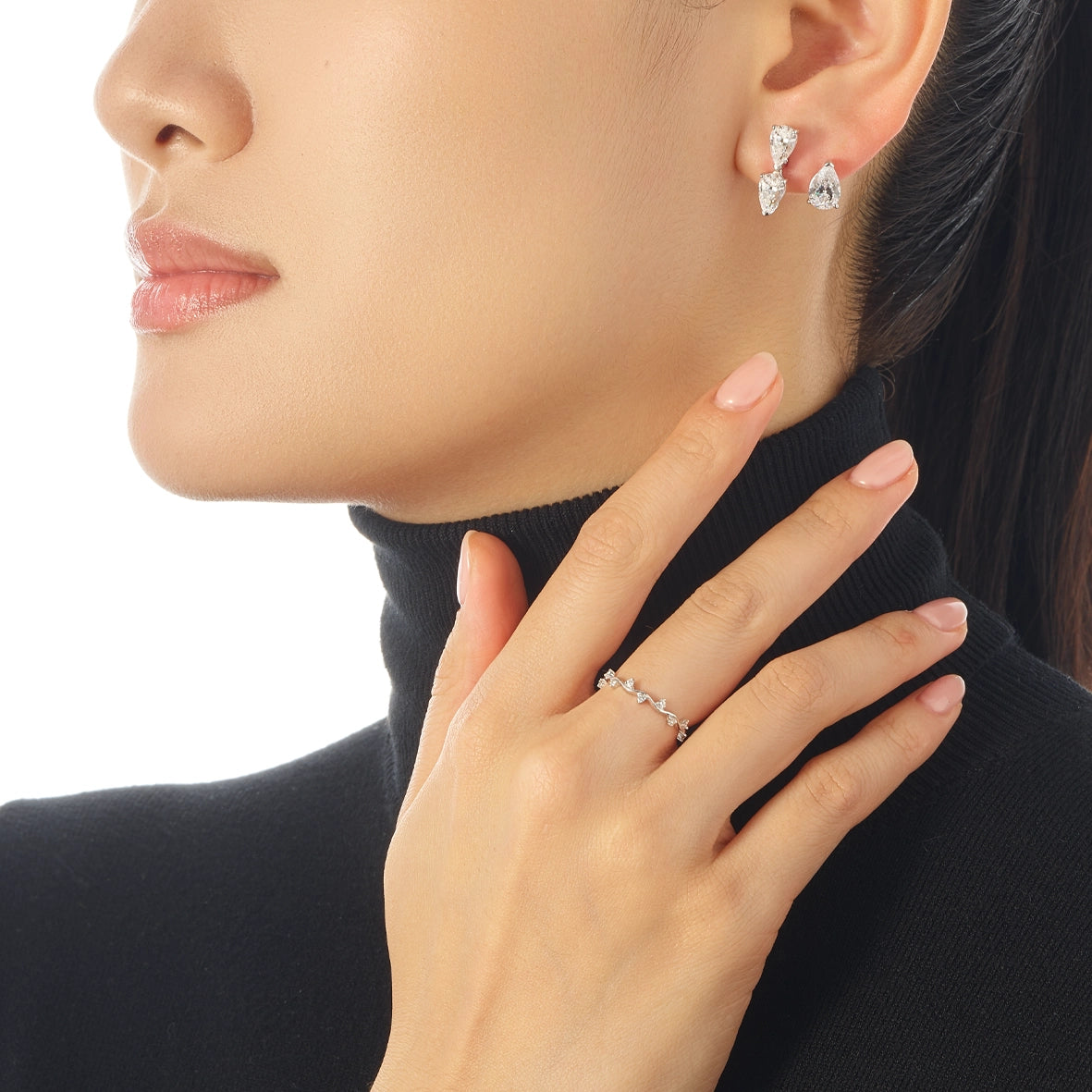 A playful and modern pair of ear huggies with butterfly backs with floating pear-cut laboratory-grown simulated white diamonds, hand-set in rhodium vermeil with 14k gold earring posts.