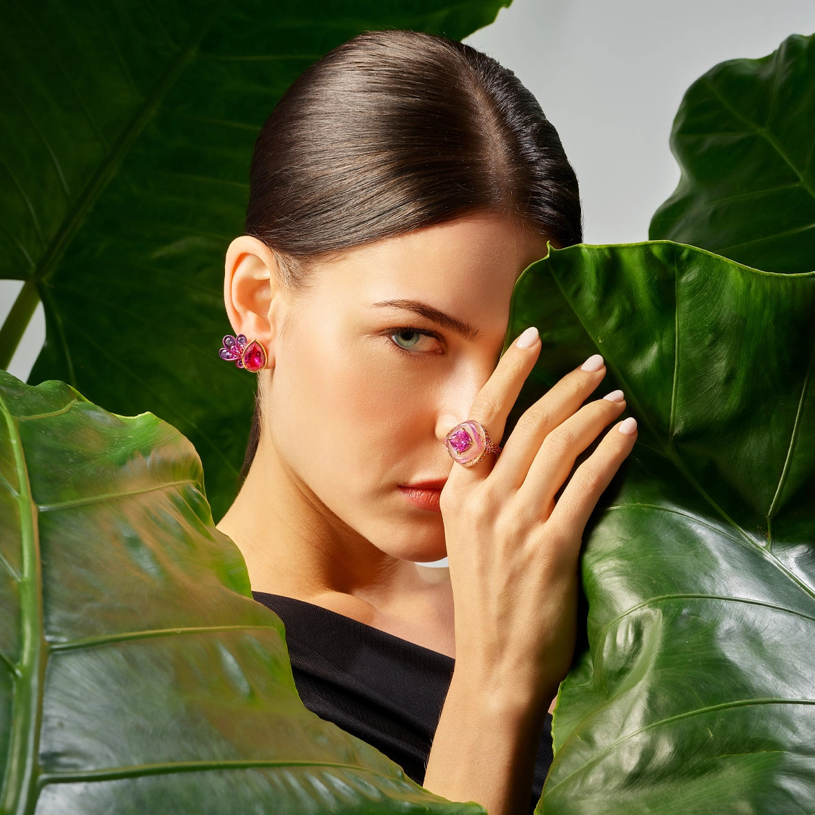 Anodised aluminium, 18k yellow gold vermeil with 14k gold earring posts, 20 laboratory-grown and created gemstones including pink sapphires and violet amethysts