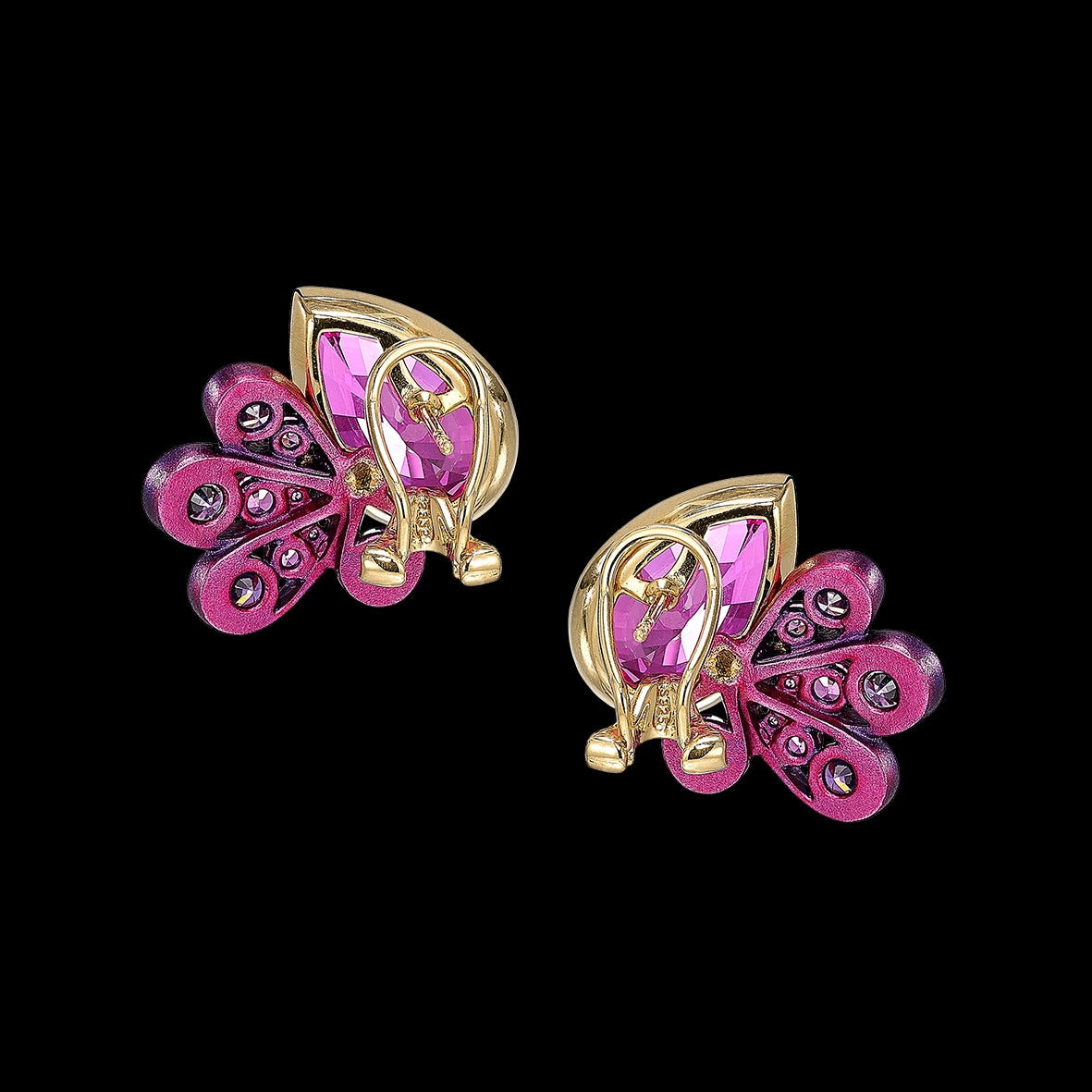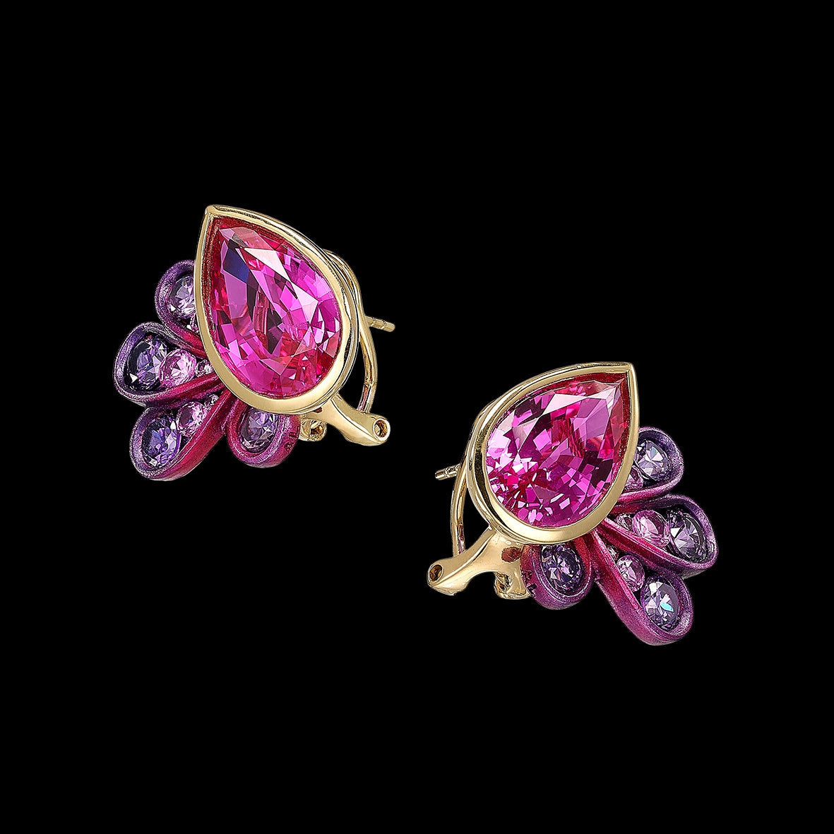 A modern, elegant and timeless pair of earrings with omega backs in anodised aluminium, 18k yellow gold vermeil with 18k gold earring posts, intricately hand-set with laboratory-grown and created gemstones including pink sapphires and violet amethysts.