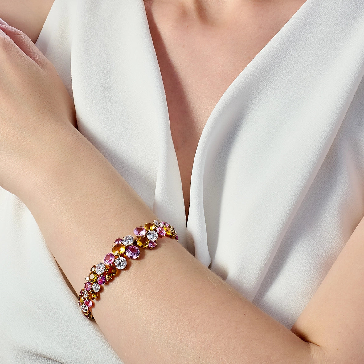 A playful eternity bracelet in 18k yellow gold vermeil, intricately hand-set with laboratory-grown and created gemstones including pink and orange sapphires, and simulated white diamonds.