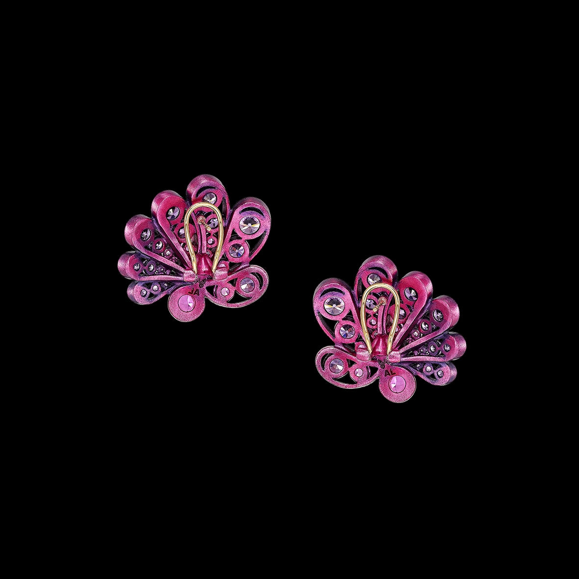 A modern, elegant and timeless pair of earrings with omega backs in anodised aluminium, 18k yellow gold vermeil with 18k gold earring posts, intricately hand-set with laboratory-grown and created gemstones including pink sapphires and violet amethysts.