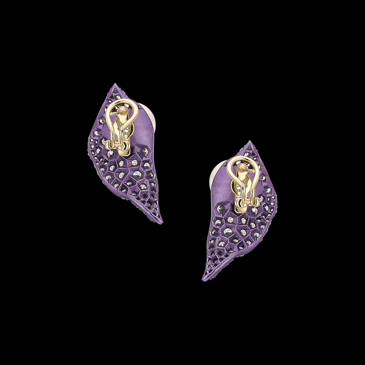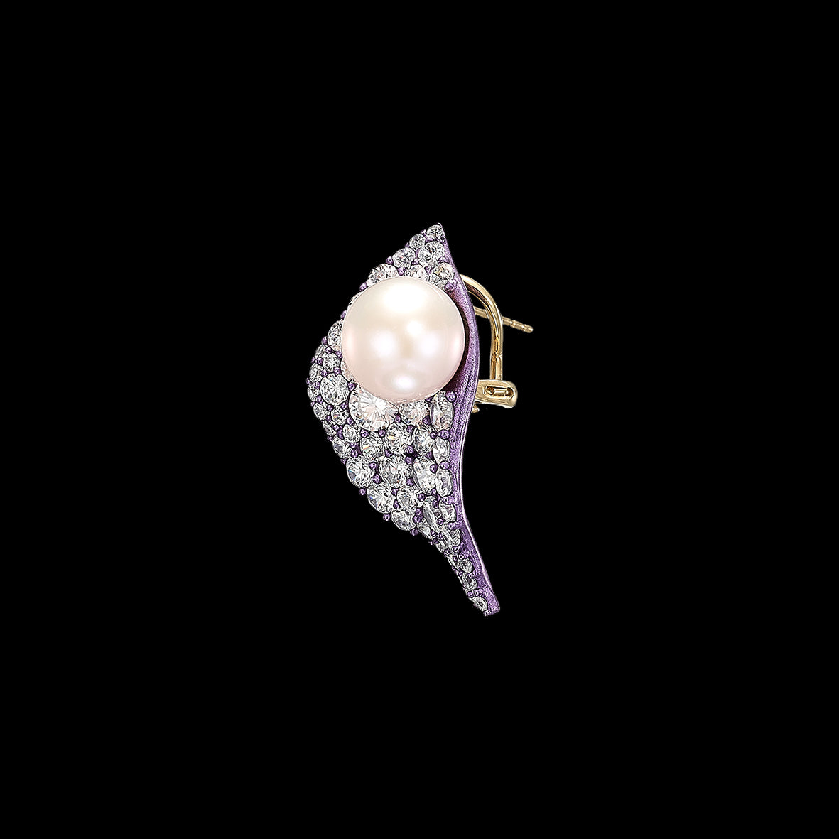 A pair of organic earrings with omega backs in recycled lavender aluminium with 18k yellow gold vermeil and 14k yellow gold earring posts, hand-set with laboratory-grown simulated white diamonds of highest brilliance with freshwater pearls, mimicking delicate dew drops resting on the jewelled petal.