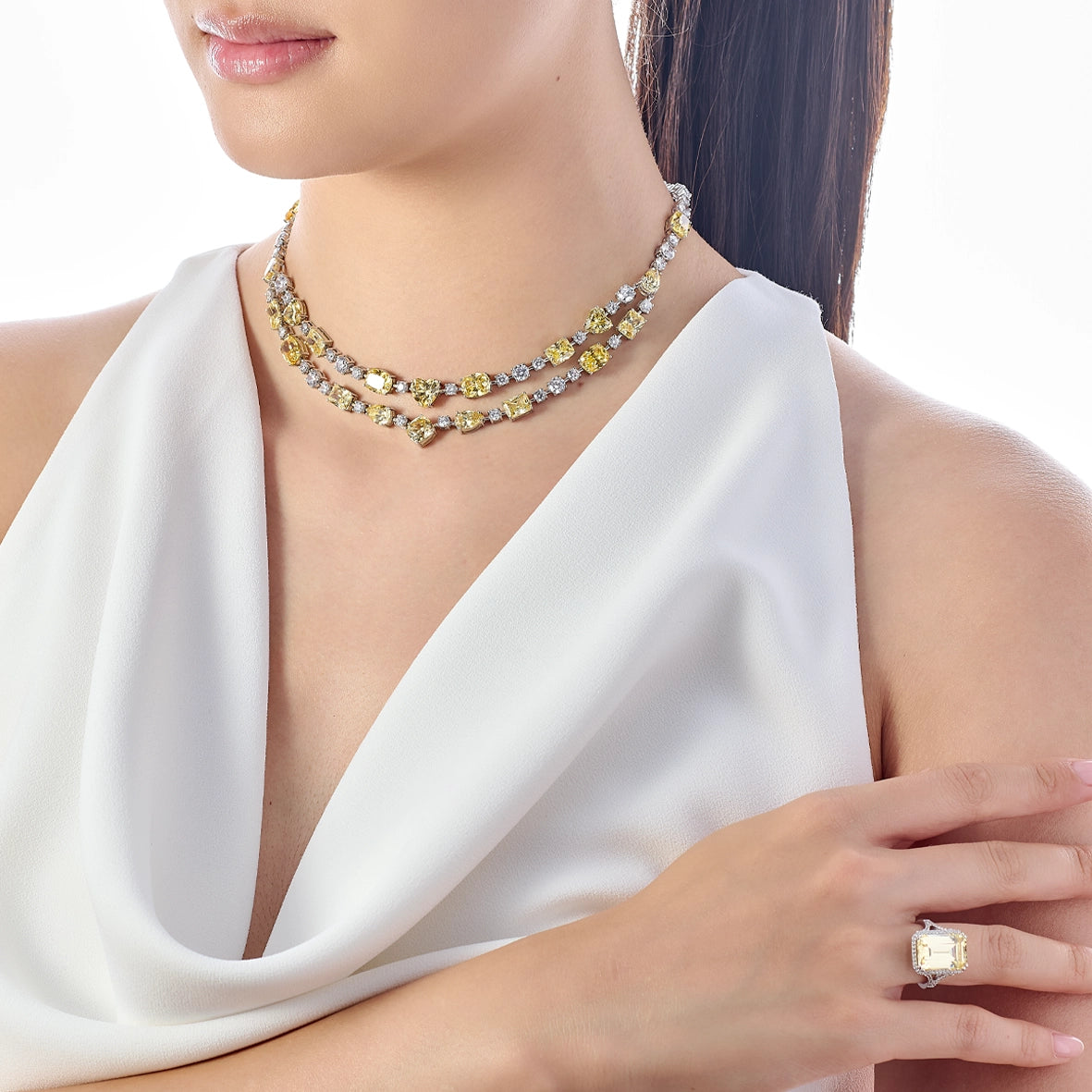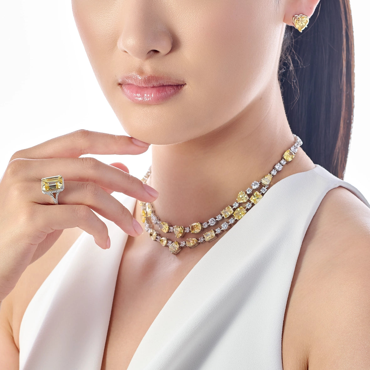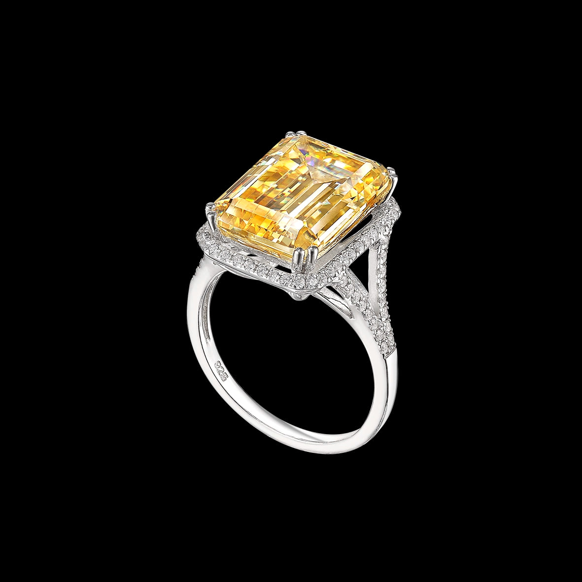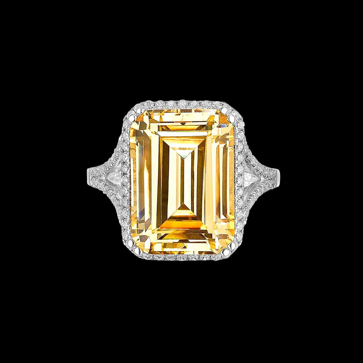 A timeless and classic ring in 18ct white gold vermeil, with a show-stopping laboratory-grown simulated central emerald cut canary diamond of 11cts., set in a delicate design of pave-set simulated white diamonds inspired by intricate embroidery.