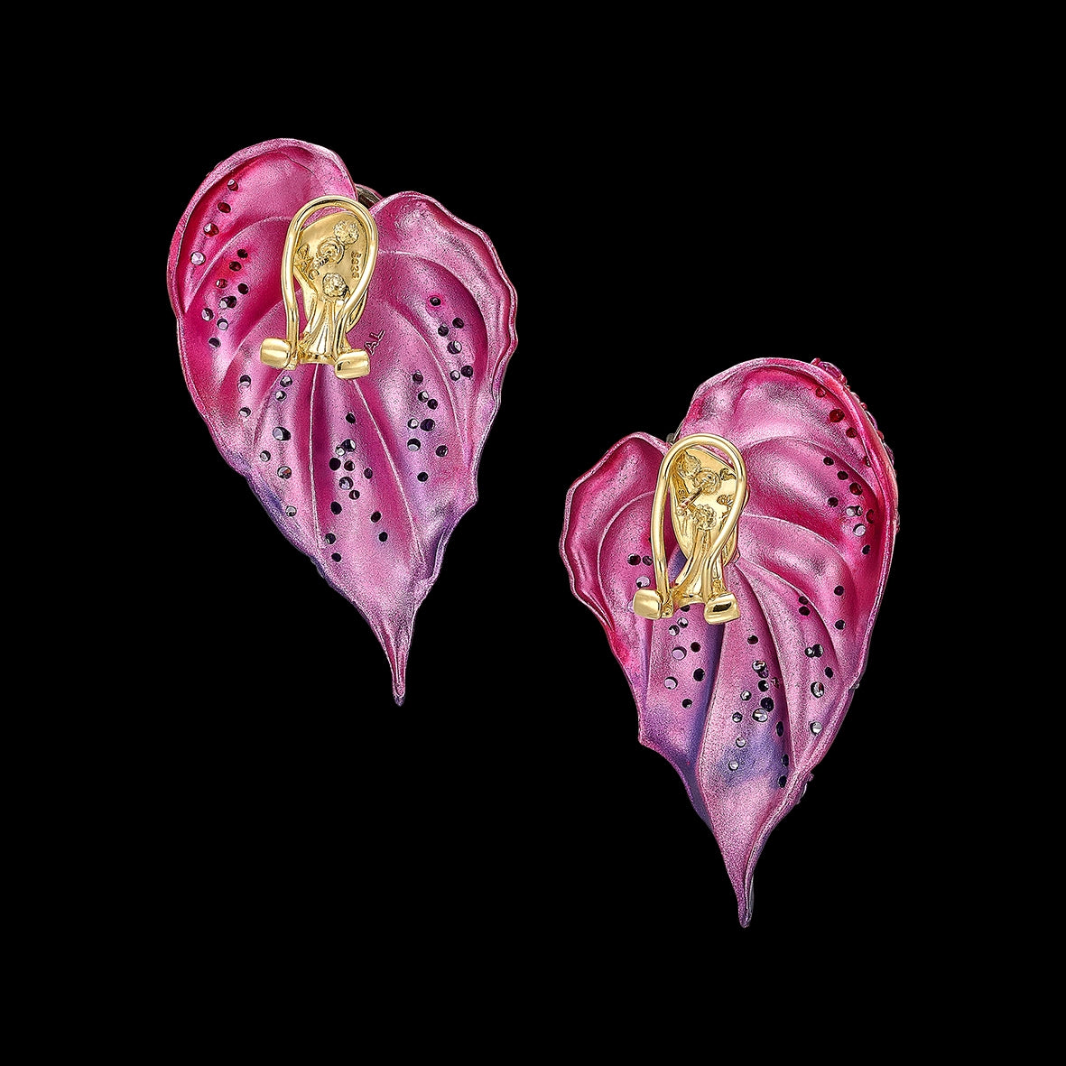 Anodised aluminium, 18k yellow gold vermeil with 14k yellow gold earrings posts, 102 laboratory-grown and created gemstones including pink sapphires and violet amethysts.