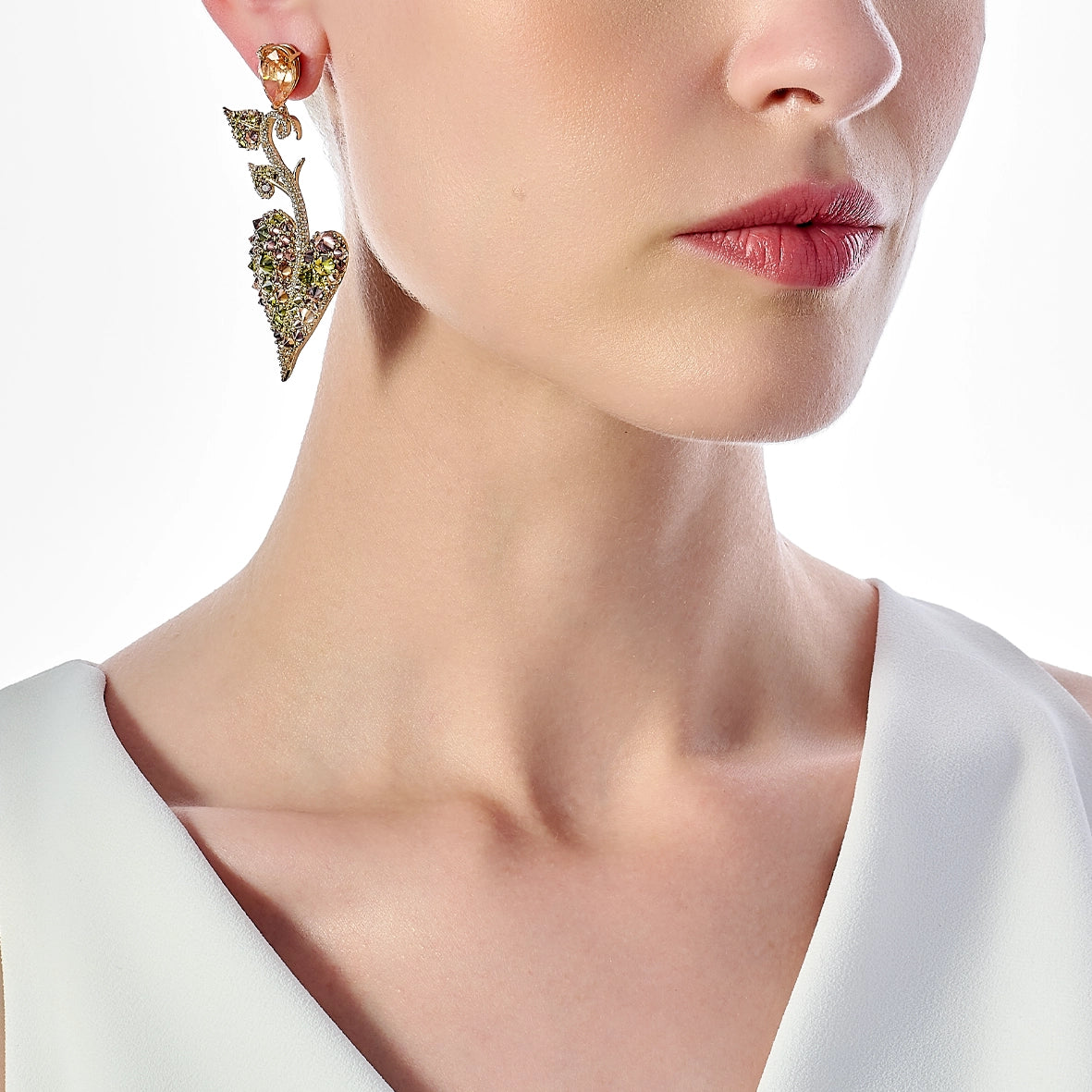 18k yellow gold vermeil with 14k gold earring posts, 443 laboratory-grown smokey quartz, green tourmalines and simulated champagne, brown and white diamonds.