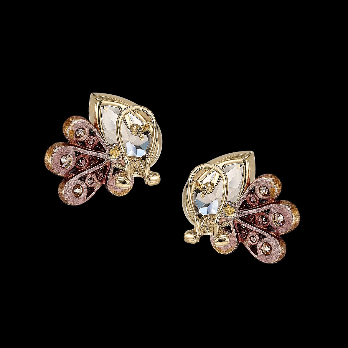 Anodised aluminium, 18k yellow gold vermeil with 14k gold earring posts, 20 laboratory-grown and created gemstones including smokey quartz with simulated brown and champagne diamonds.