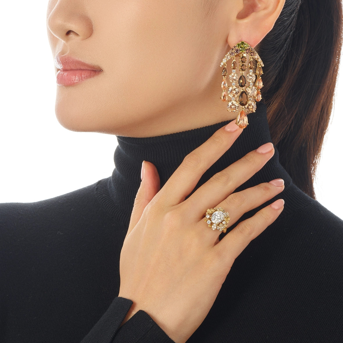 A playful pair of dazzling chandelier earrings with omega backs, hand-crafted in 18k yellow gold vermeil with 14k gold earring posts, featuring an autumnal ombré cascade of laboratory-grown and created gemstones including pear and round brilliant-cut chocolate and cognac diamonds, orange sapphires, orange citrines, green and olive green tourmalines.