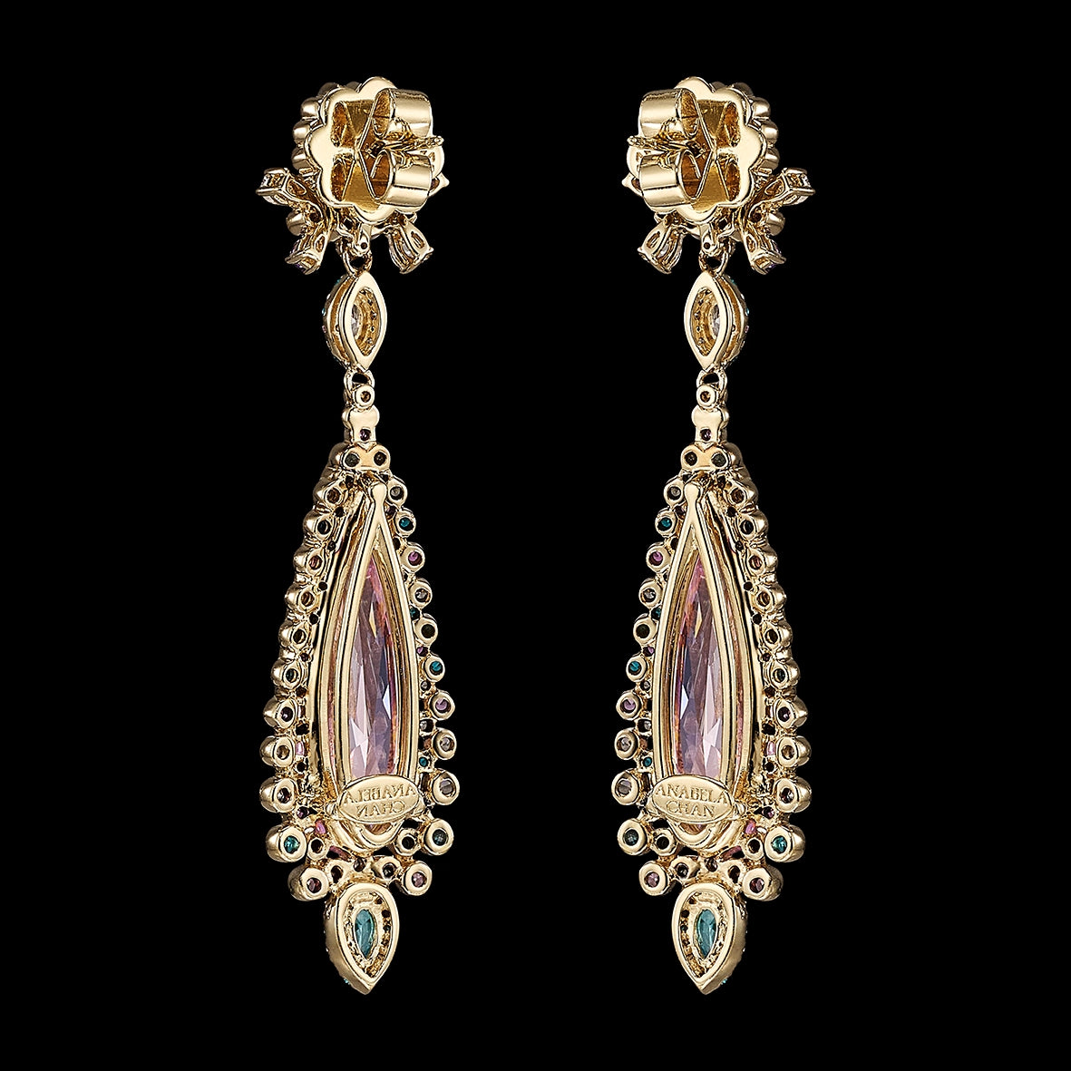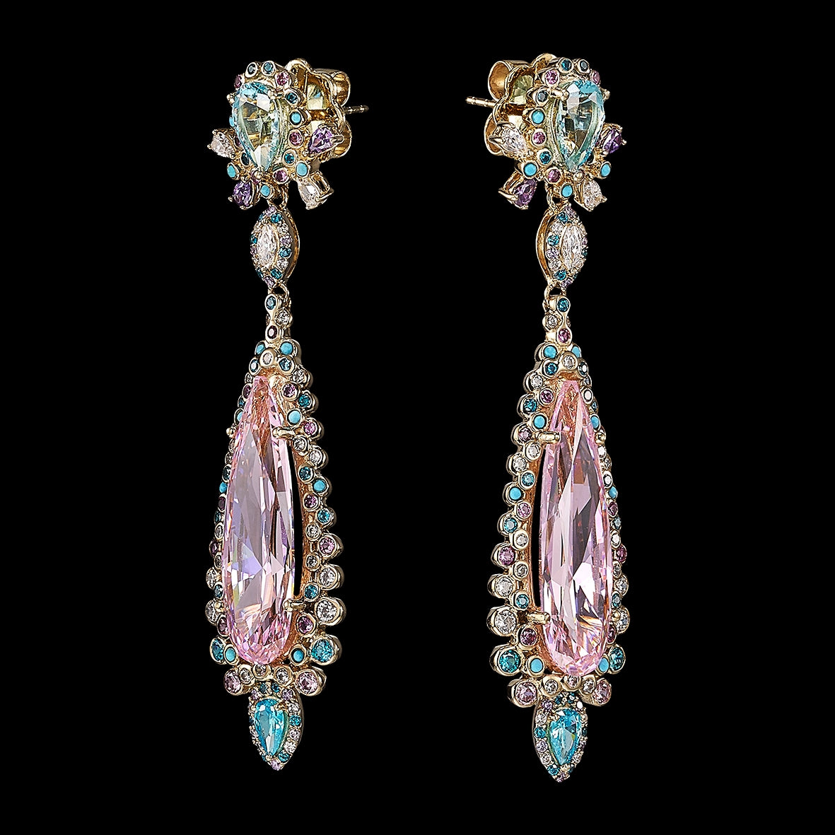 An elegant and dramatic pair of cocktail earrings with butterfly backs in 18k yellow gold vermeil with 14k gold earring posts, intricately hand-set with laboratory-grown and created gemstones including two stunning blush pink sapphires, paraiba tourmalines, violet and lilac amethysts, turquoise and simulated white diamonds.