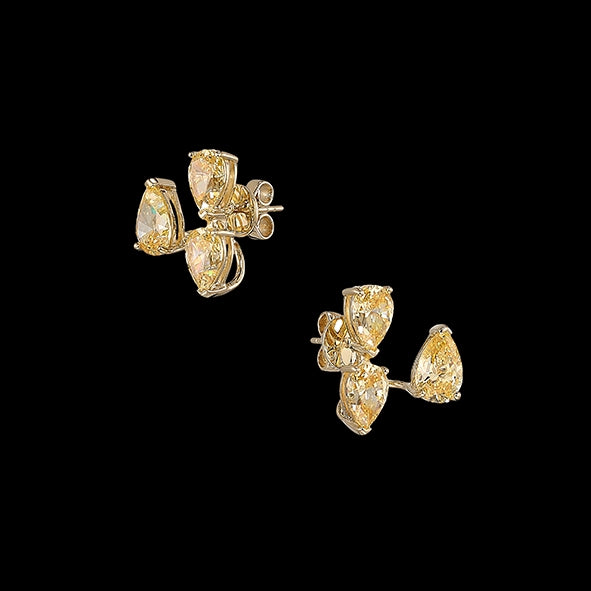 A playful and modern pair of ear huggies with butterfly backs with floating pear-cut laboratory-grown simulated canary diamonds, hand-set in rhodium vermeil with 14k gold earring posts.