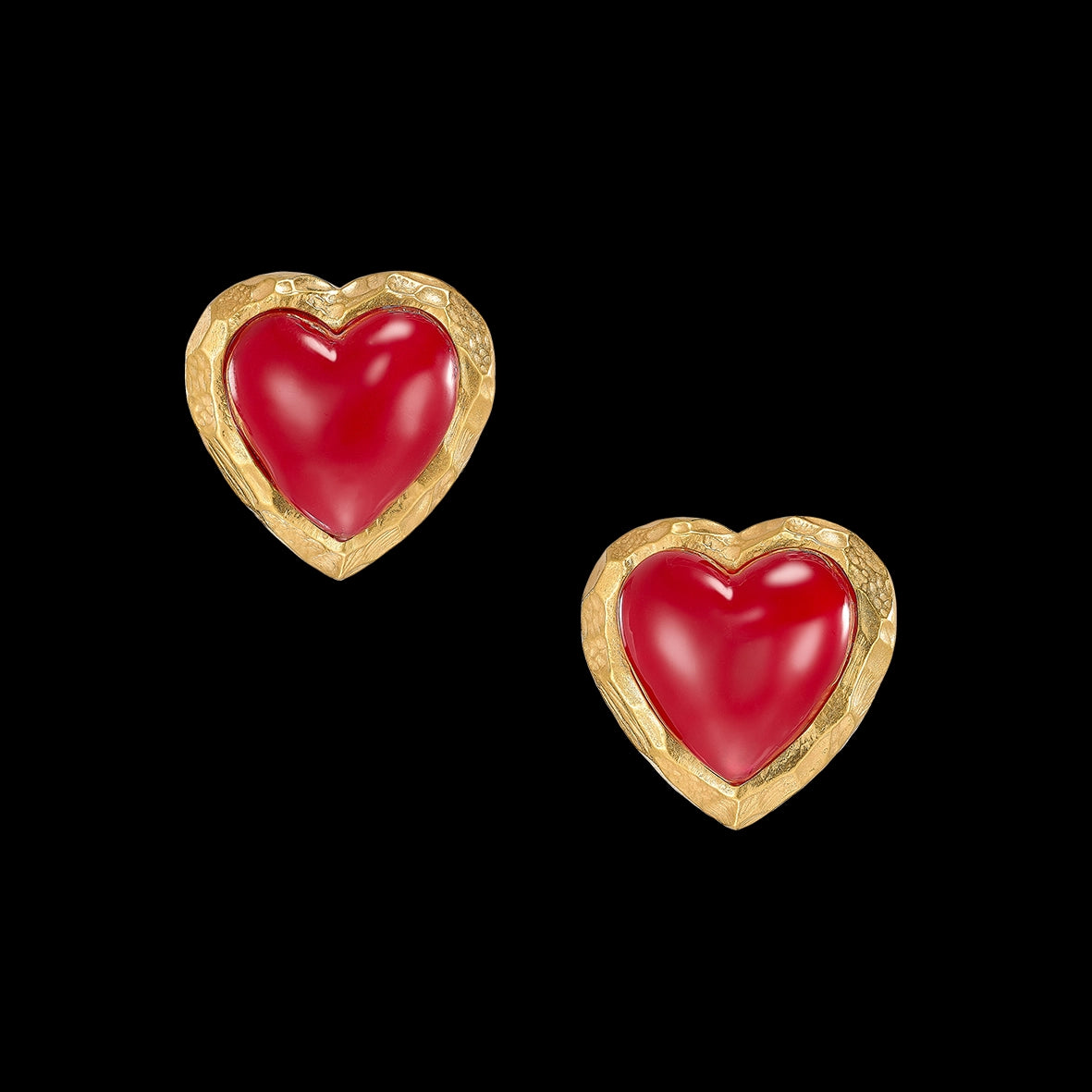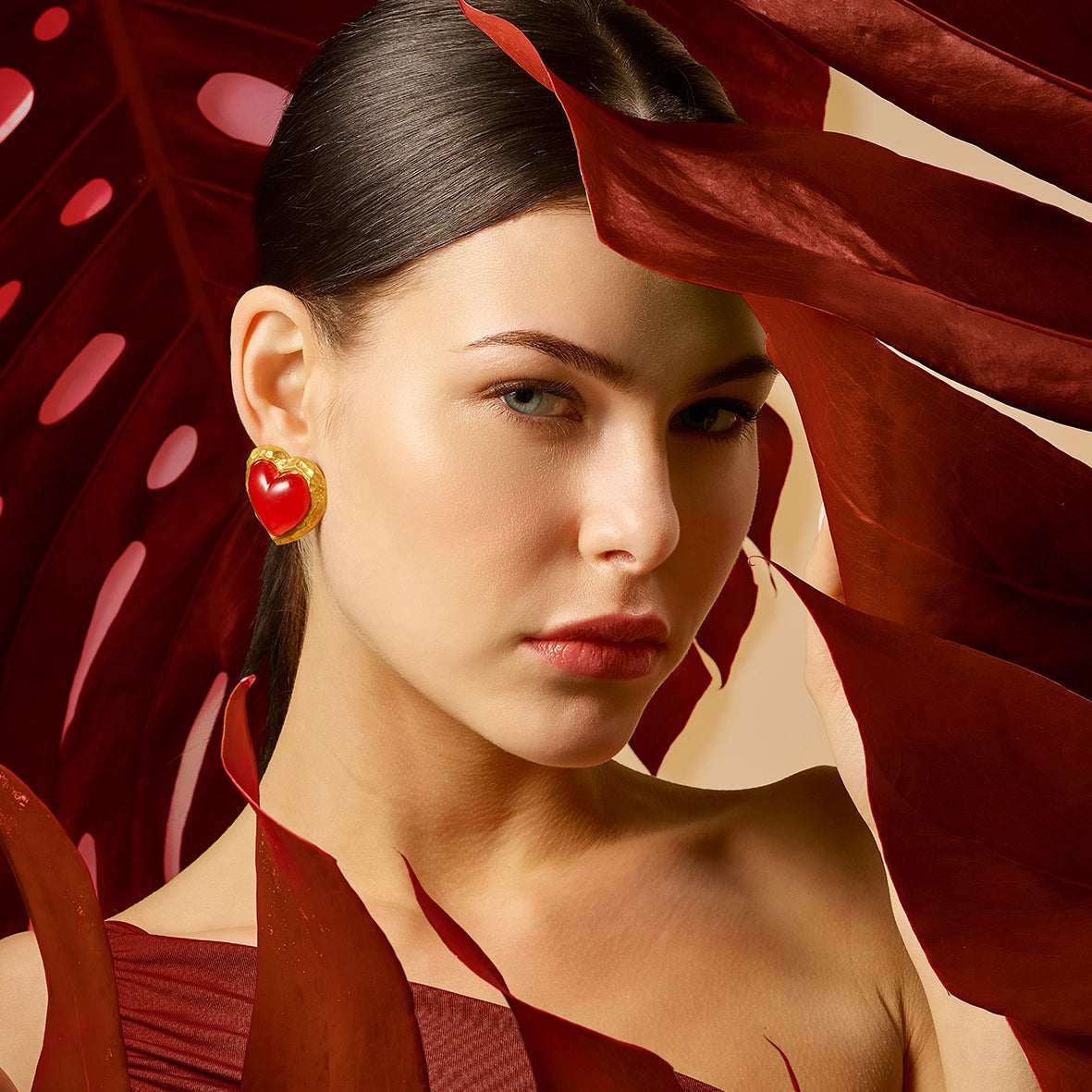 The Cherry Heart Earrings are handcrafted with handcrafted with Tomato Fruit Gems™, with betalains contributing to hues of red extracted from beetroots casted into the form of puffy hearts.