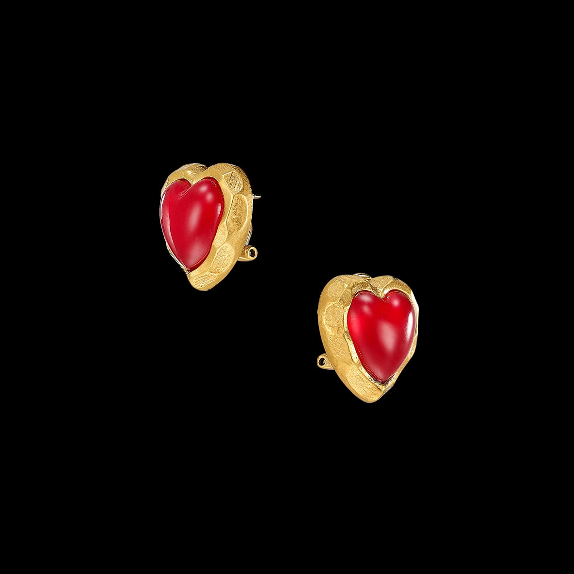 The Cherry Heart Studs are handcrafted with tomato mix carnelian Fruit Gems™, with betalains contributing to hues of red extracted from beetroots casted into the form of puffy hearts.