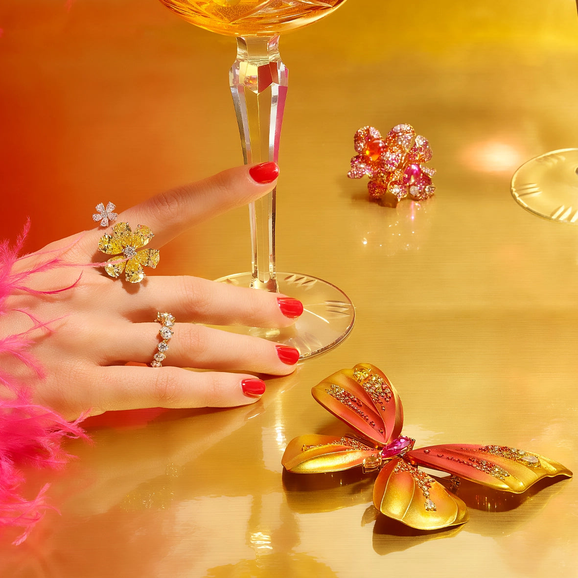 A playful stacking ring in 18k yellow gold vermeil with a dazzling array of round brilliant and oval-cut laboratory-grown simulated white diamonds of 4.7 carats in total weight.
