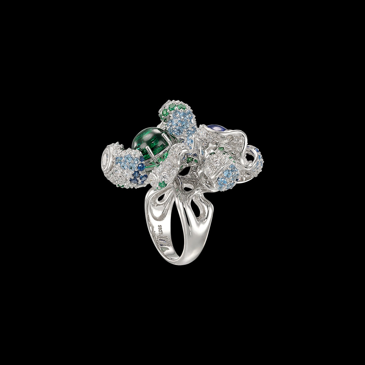 Rhodium vermeil with laboratory-grown and created gemstones including fuchsia pink sapphires, orange sapphires, blush pink sapphires, orange garnet and simulated white diamonds