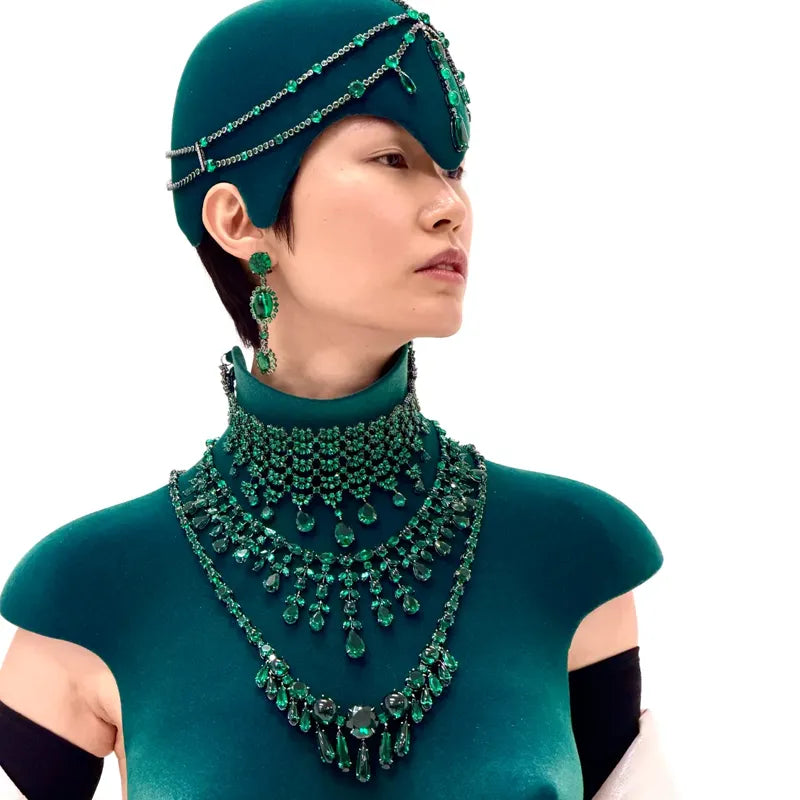 A pair of statement earrings crafted from black rhodium vermeil with 14k gold earrings posts and omega backs, hand-set with an array of 74 oval and round brilliant cut laboratory-grown and created emeralds totalling 61.7cts.