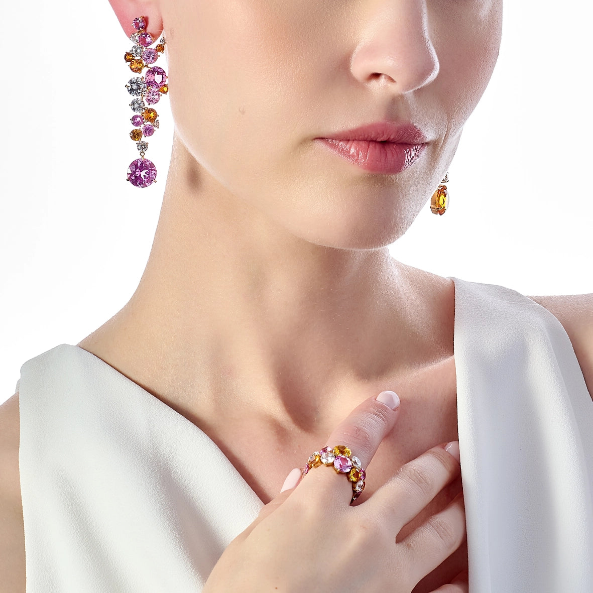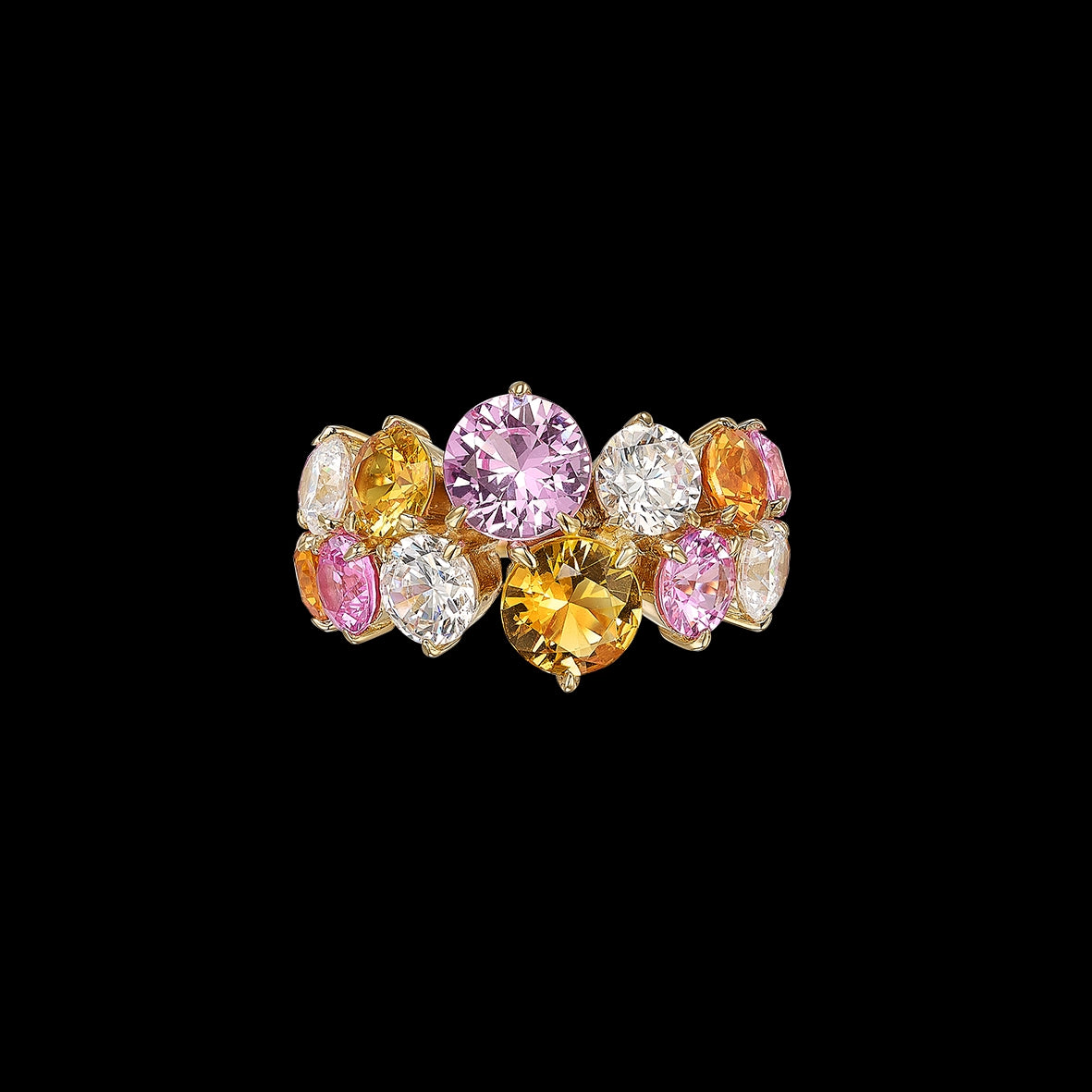 A playful ring in 18k yellow gold vermeil, intricately hand-set with laboratory-grown and created gemstones including pink and orange sapphires, and simulated white diamonds.