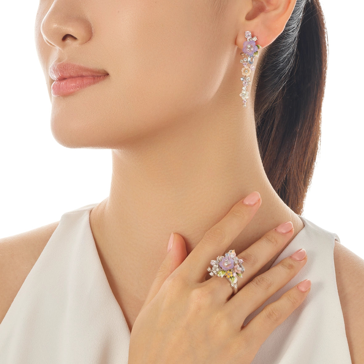 18k white gold & rhodium vermeil, 14k gold earring posts with laboratory-grown and created gemstones including sky blue spinels, blush pink sapphires, simulated champagne and white diamonds, with carved mother-of-pearl flowers and hand-painted enamel buds and leaves.