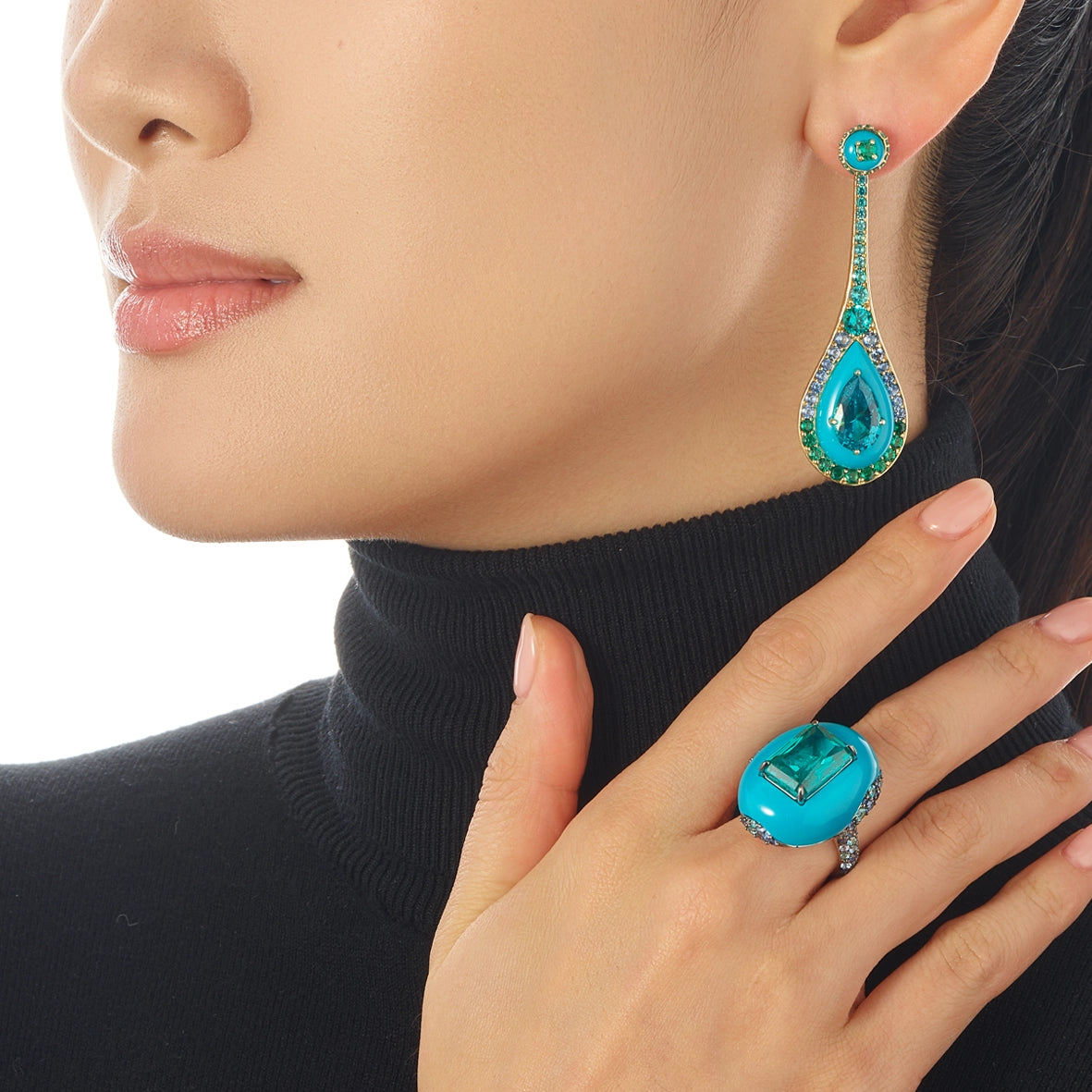 Regenerative™ turquoise, rhodium vermeil, 14k white gold earring posts, 68 laboratory-grown and created paraiba tourmalines, blue topaz and blue sapphires.
