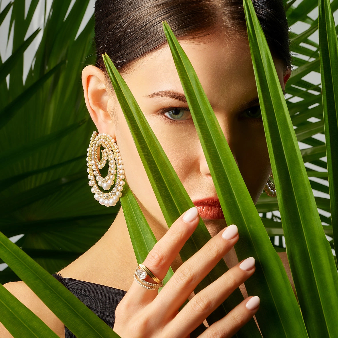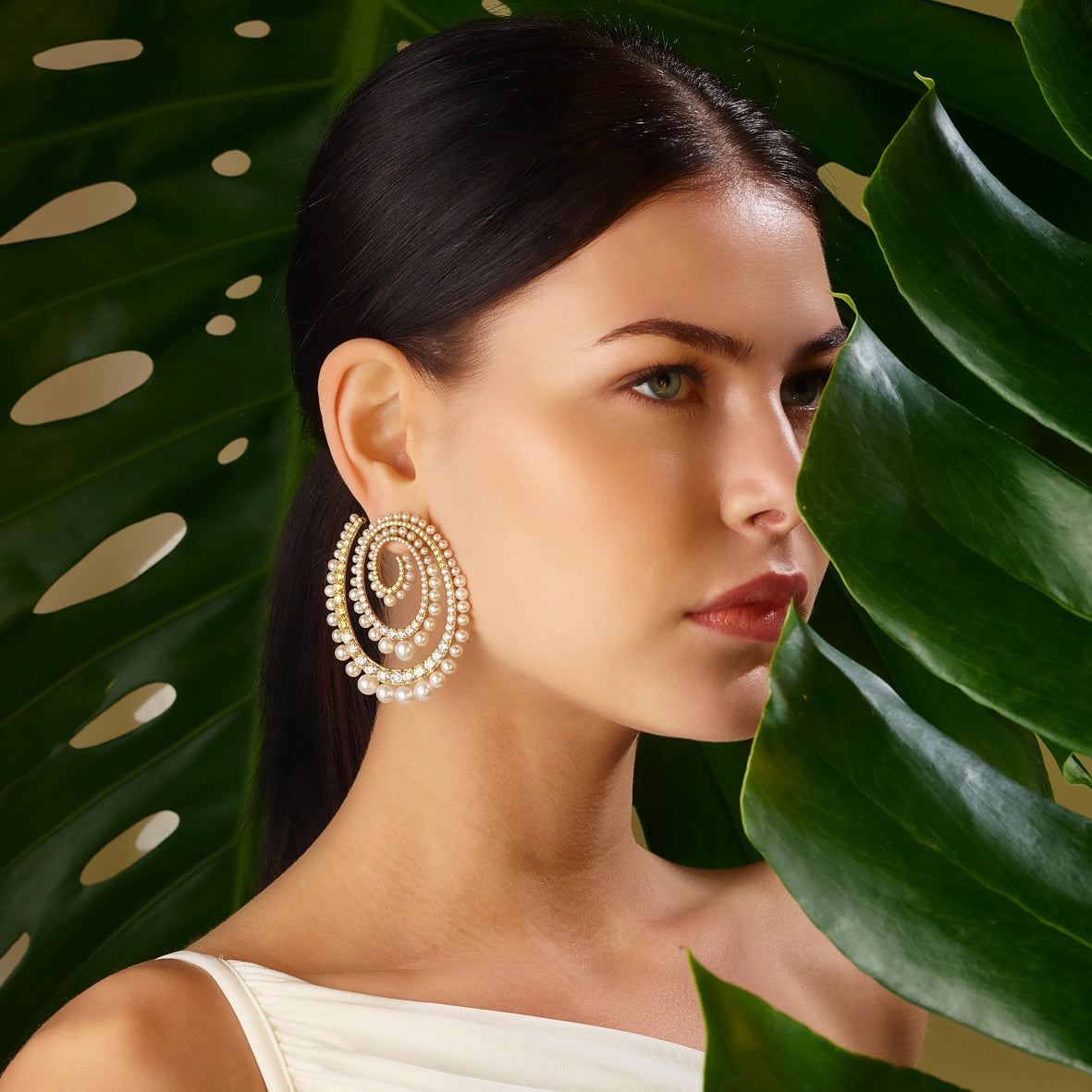 A dramatic pair of hoop earrings in 18k yellow gold vermeil with 14k gold earrings posts and butterfly backs, intricately hand-set with 110 laboratory-grown simulated white and canary diamonds and 152 graduating natural ivory freshwater pearls.