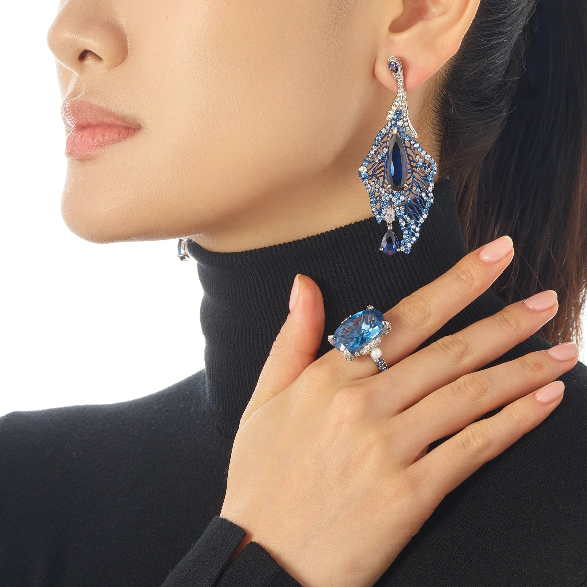 A stunning pair of earrings with butterfly backs in recycled midnight blue aluminium, white rhodium vermeil with 14k gold earring posts, intricately hand-set with laboratory-grown and created gemstones including two central royal blue sapphires, cornflower blue sapphires and simulated white diamonds.