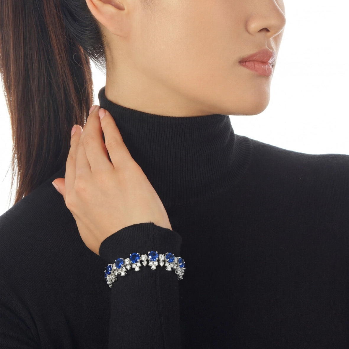 A playful yet statement bracelet in 18k white gold and rhodium vermeil, featuring a constellation of laboratory grown and created gemstones including synthesised Kashmir blue sapphires and simulated round brilliant white diamonds.
