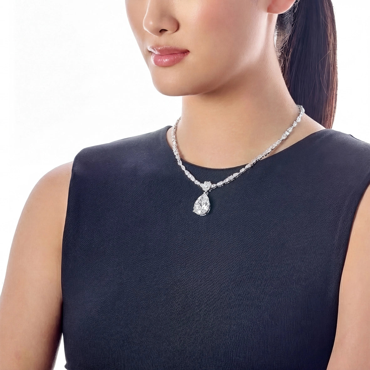 A playful necklace in rhodium vermeil, hand-set with laboratory-grown simulated white diamonds with a pear-cut pendant white simulated diamond of 13.7Ct.