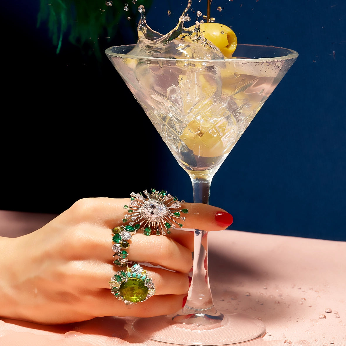 A stunning cocktail ring in 18k white gold & rhodium vermeil, hand-set with a rainbow array of luscious laboratory-grown and created gemstones including a solitaire oval olive-green tourmaline of 12 carats, prong-set emeralds and canary citrines, blue spinel, turquoise cabochons, simulated canary and white diamonds with total weight of over 18 carats.