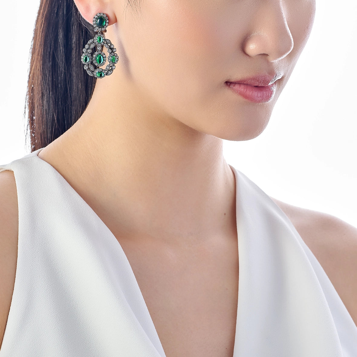 A pair of stunning intricate earrings inspired by the royal Maharajah Jewels, in 18k blackened gold and rhodium vermeil with 18k gold earring posts, hand pavé-set with over 22 carats of laboratory-grown and created gemstones including 6 oval emerald cabochons and 204 white diamonds.