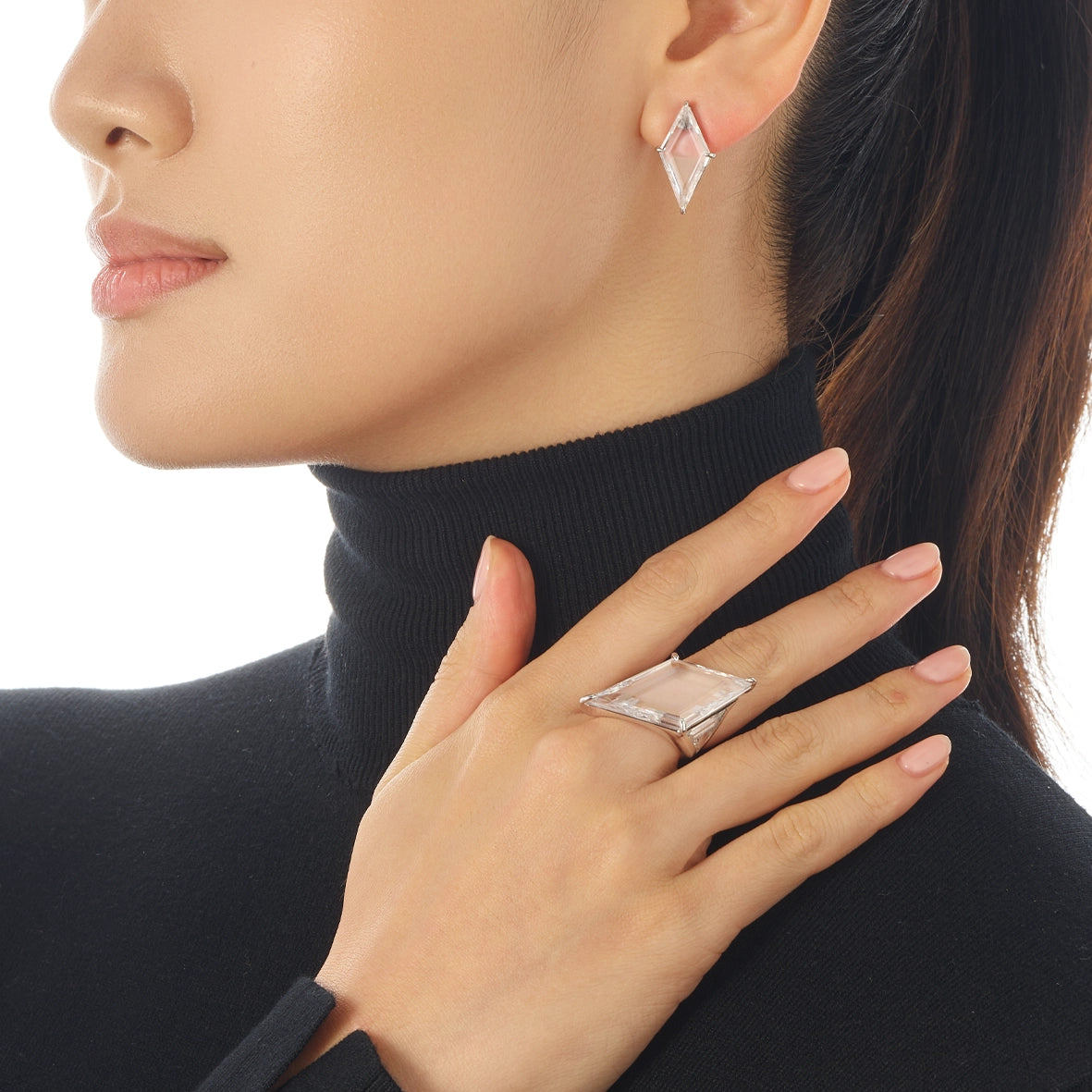 A pair of ear studs hand-set with custom portrait cut laboratory-grown white sapphires of 7 carats in total weight mimicking shards of shattered glass - a new tale of duality of light and darkness. Crafted in recycled rhodium vermeil, with 14k white gold earrings posts and butterfly backs.