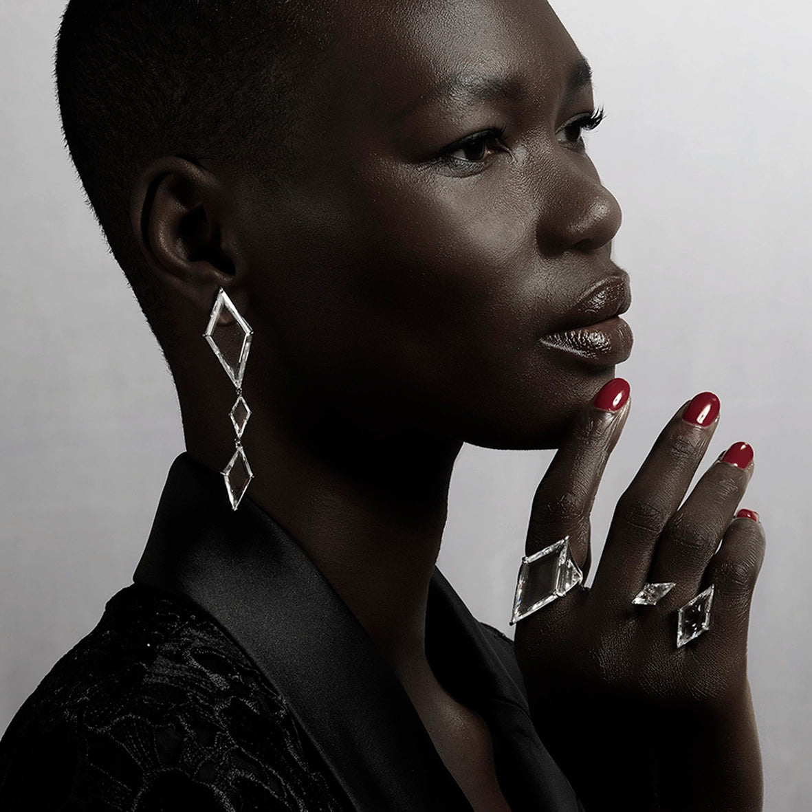 A pair of shimmering earrings hand-set with custom portrait cut laboratory-grown white sapphires of 49.2 carats in total weight, mimicking shards of shattered glass - a new tale of duality of light and darkness. Crafted in recycled rhodium vermeil, with 14k white gold earrings posts and butterfly backs.