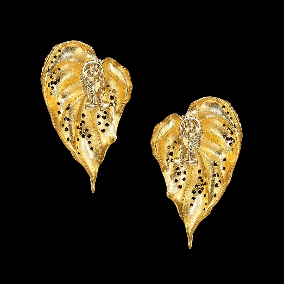 A stunning pair of feather-light earrings in recycled aluminium with 24k yellow gold PVD, with omega backs and 14k gold earring posts, intricately hand-set with laboratory-grown and created gemstones including 2 spectacular turquoise cabochons and white topaz.